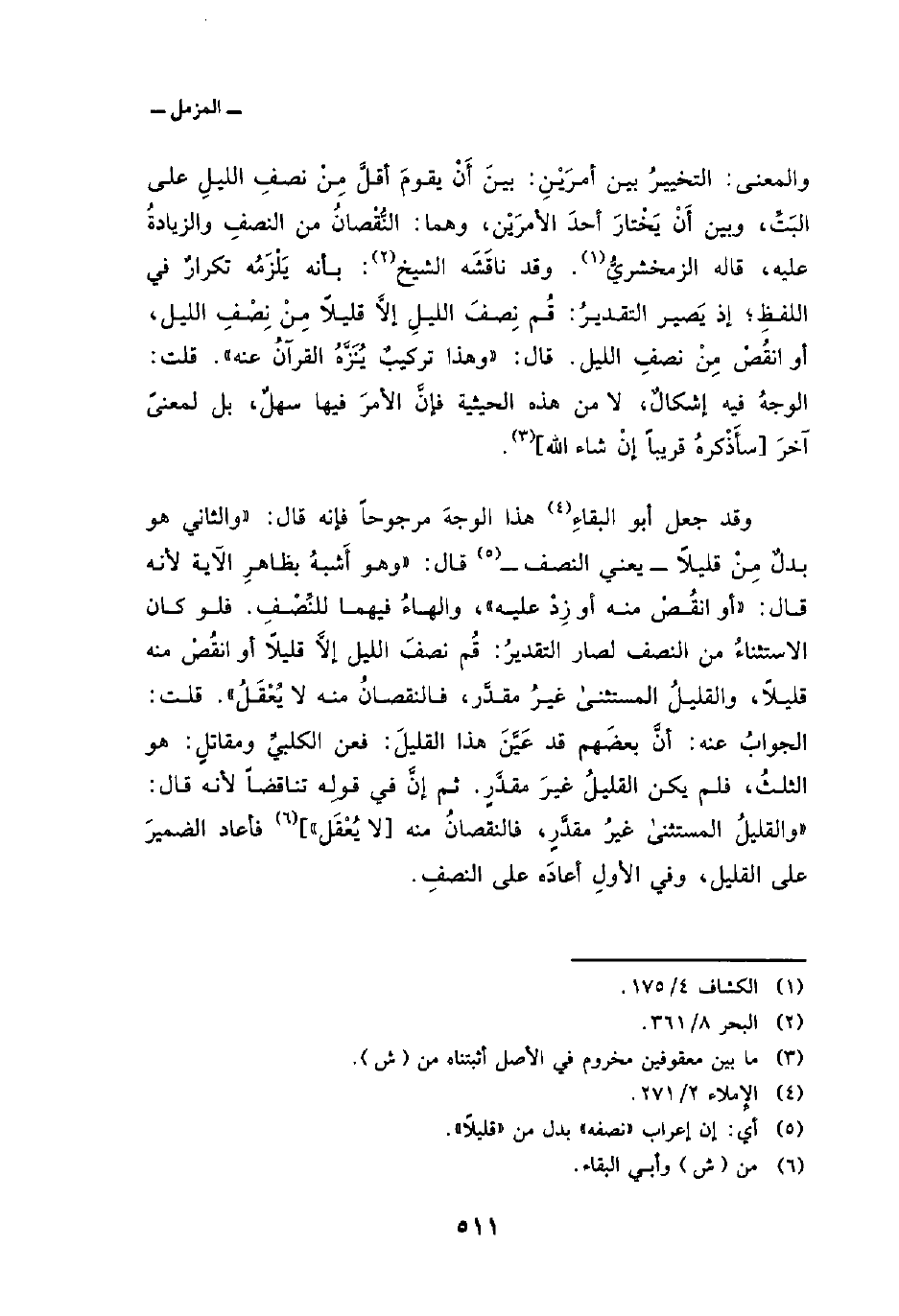 اعلم أنَّ في هذه الآيةِ ثمانيةَ أوجهٍ أحدُها: أنَّ «نصفَه» بدلٌ من «الليلَ» بدلُ بعضٍ من كلٍ. و «إلاَّ قليلاً» استثناءٌ من النصفِ كأنه قيل: قُمْ أقلَّ مِنْ نصفِ الليلِ. والضميرُ في «مِنْه» و «عليه» عائدٌ على النصفِ.