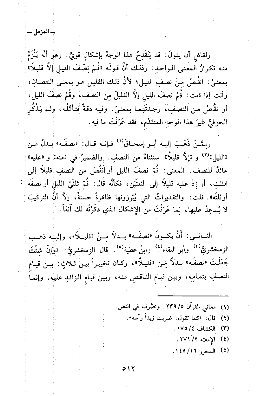 وقد جعل أبو البقاءِ هذا الوجهَ مرجوحاً فإنه قال: «والثاني هو بدلٌ مِنْ قليلاً يعني النصف قال:» وهو أَشبهُ بظاهرِ الآية لأنه قال: «أو انقُصْ منه أو زِدْ عليه» ، والهاءُ فيهما للنِّصْفِ. فلو كان الاستثناءُ من النصف لصار التقديرُ: قُم نصفَ الليل إلاَّ قليلاً أو انقُصْ منه قليلاً، والقليلُ المستثنى غيرُ مقدَّر، فالنقصانُ منه لا يُعْقَلُ «. قلت: الجوابُ عنه: أنَّ بعضَهم قد عَيَّنَ هذا القليلَ: فعن الكلبيِّ ومقاتلٍ: هو الثلثُ، فلم يكن القليلُ غيرَ مقدَّرٍ. ثم إنَّ في قولِه تناقضاً لأنه قال:» والقليلُ المستثنى غيرُ مقدَّرٍ، فالنقصانُ منه [لا يُعْقَل «] فأعاد الضميرَ على القليل، وفي الأولِ أعادَه على النصفِ.