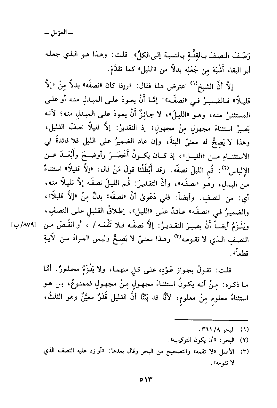 الثاني: أَنْ يكونَ «نصفَه» بدلاً مِنْ «قليلاً» ، وإليه ذهب الزمخشريُّ وأبو البقاء وابنُ عطية. قال الزمخشريُّ: «وإنْ شِئْتَ جَعَلْتَ» نصفَه «بدلاً مِنْ» قليلاً «، وكان تخييراً بين ثلاثٍ: بين قيامِ النصفِ بتمامِه، وبين قيامِ الناقصِ منه، وبين قيامِ الزائدِ عليه، وإنما