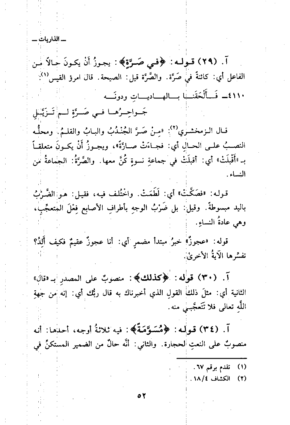 قال الزمخشري: «مِنْ صَرَّ الجُنْدُبُ والبابُ والقلمُ. ومحلُّه النصبُ على الحالِ أي: فجاءَتْ صارَّةً» ، ويجوزُ أَنْ يكونَ متعلقاً ب «أَقْبَلَتْ» أي: أقبلَتْ في جماعةِ نسوةٍ كُنَّ معها. والصَّرَّةُ: الجماعةُ من النساء.