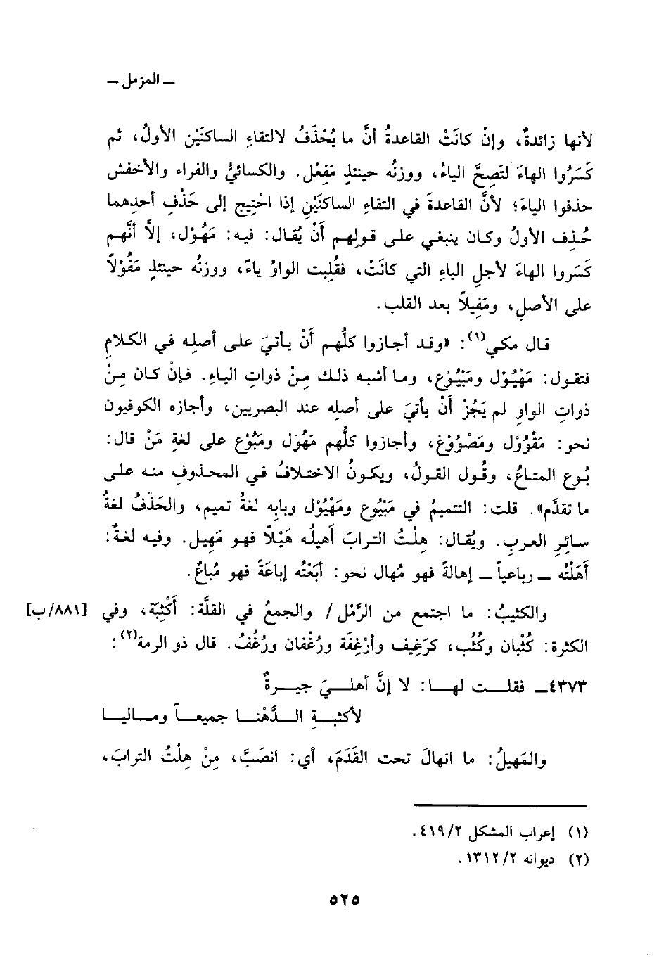 قوله: {مَّهِيلاً} أصلُه مَهْيُول كمَضْروب، فاستُثْقِلَتِ الضمةُ على الياءِ فنُقِلَتْ إلى الساكن قبلَها، وهو الهاءُ، فالتقى ساكنان. فاختلف النحاةُ في العمل في ذلك: فسيبويه وأتباعُه حذفوا الواوَ، وكانَتْ أَوْلى بالحَذْفِ؛