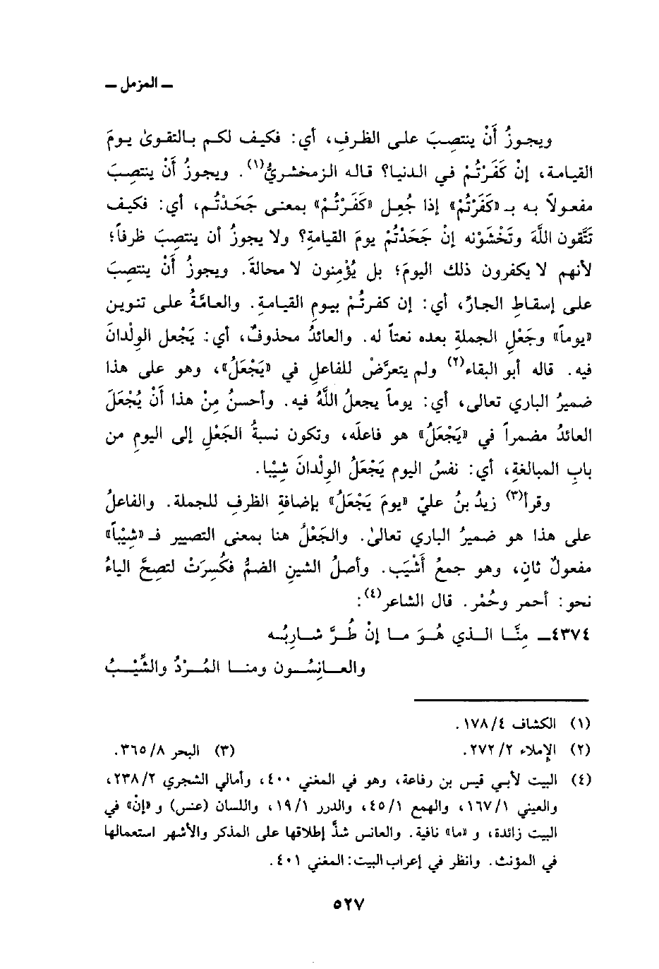 قوله: {يَوْماً} : منصوبٌ إمَّا ب «تَتَّقُون» على سبيلِ المفعولِ به تجوَّزاً. وقال الزمخشري: «يوماً» مفعولٌ به، أي: فكيف تَقُوْنَ أنفسَكم يومَ القيامةِ وهَوْلَه إنْ بَقِيْتُمْ على الكفرِ؟ «. وناقشه الشيخُ فقال:» وتَتَّقون مضارعُ اتَّقى، واتَّقى ليس بمعنى وَقَى حتى يُفَسِّرَه به، واتقَّى يتعدَّى إلى واحدٍ، ووَقَى يتعدَّى إلى اثنين. قال تعالى: {وَوَقَاهُمْ عَذَابَ الجحيم} [الدخان: 56] . ولذلك قَدَّره الزمخشريُّ ب تَقُون أنفسَكم، لكنه ليس «تَتَّقون» بمعنى يَقُوْن، فلا يُعَدَّى تَعْديَتَه «انتهى.