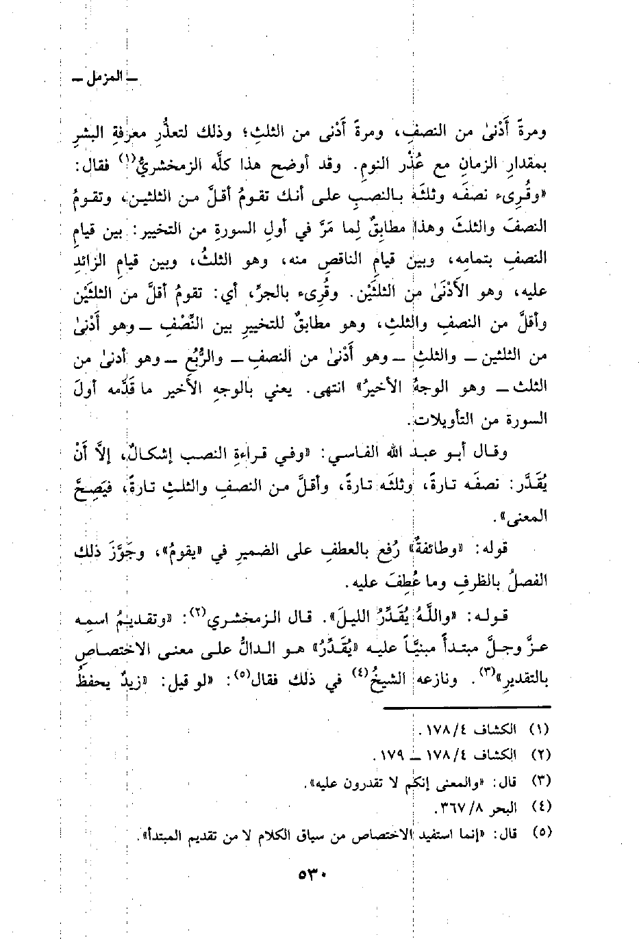 قوله: {وَنِصْفَهُ وَثُلُثَهُ} قرأ الكوفيون وابن كثير بنصبِهما، والباقون بجرِّهما. وفي الجرِّ إشكالٌ كما سيأتي. فالنصبُ نَسَقٌ على «أَدْنى» لأنه بمعنى: وَقْتٌ أَدْنى، أي: أقربُ. اسْتُعير الدنُوُّ لقُرْبِ المسافةِ في الزمانِ وهذا مطابقٌ لِما في أولِ السورةِ من التقسيمِ: وذلك أنَّه إذا قام أَدْنَى مِنْ ثُلُثي الليلِ صَدَقَ عليه أنه قام الليلَ إلاَّ قليلاً؛ لأنَّ الزمانَ الذي لم يَقُمْ فيه يكون الثلث وشيئاً من الثلثَيْن، فيَصْدُقُ عليه قولُه: «إلاَّ قليلاً» . وأمَّا قولُه «ونِصْفَه» فهو مطابقٌ لقولِه أولاً «نِصْفَه» وأمَّا قولُه: «وثُلُثَه» فإنَّ قولَه: {أَوِ انقص مِنْهُ} قد ينتهي النَّقْصُ في القليل إلى أن يكونَ الوقتُ ثلثي الليلِ. وأمَّا قولُه: {أَوْ زِدْ عَلَيْهِ} فإنَّه إذا زاد على النصفِ قليلاً كان الوقتُ أقلَّ مِنَ الثلثَيْن. فيكونُ قد طابق أدْنى مِنْ ثلثي الليل، ويكون قولُه تعالى: {نِّصْفَهُ أَوِ انقص مِنْهُ قَلِيلاً} شَرْحاً لمُبْهَمِ ما دَلَّ عليه قولُه: {قُمِ الليل إِلاَّ قَلِيلاً} . وعلى قراءةِ النصبِ فَسَّر الحسنُ «تُحْصُوه» بمعنى تُطيقوه.