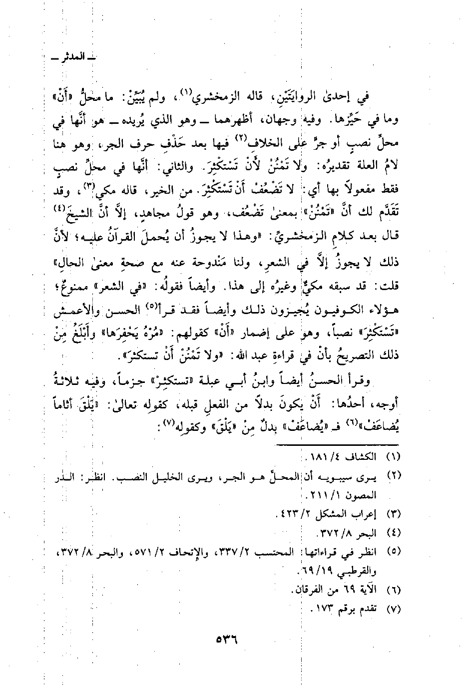في إحدى الروايَتَيْن، قاله الزمخشري، ولم يُبَيِّنْ: ما محلُّ «أَنْ» وما في حَيِّزها. وفيه وجهان، أظهرهما وهو الذي يُريده هو أنَّها في محلِّ نصبٍ أو جرٍّ على الخلافِ فيها بعد حَذْفِ حرف الجر، وهو هنا لامُ العلة تقديرُه: ولا تَمْنُنْ لأَنْ تَسْتكْثِرَ. والثاني: أنَّها في محلِّ نصبٍ فقط مفعولاً بها أي: لا تَضْعُفْ أَنْ تَسْتكْثِرَ. من الخير، قاله مكي، وقد تَقَدَّم لك أنَّ «تَمْنُنْ» بمعنى تَضْعُف، وهو قولُ مجاهدٍ، إلاَّ أنَّ الشيخَ قال بعد كلامِ الزمخشريِّ: «وهذا لا يجوزُ أن يُحملَ القرآنُ عليه؛ لأنَّ ذلك لا يجوزُ إلاَّ في الشعرِ، ولنا مَنْدوحة عنه مع صحةِ معنى الحالِ» قلت: قد سبقه مكيٌّ وغيرُه إلى هذا. وأيضاً فقولُه: «في الشعر» ممنوعٌ؛ هؤلاء الكوفيون يُجيزون ذلك وأيضاً فقد قرأ الحسن والأعمش «تَسْتَكْثِرَ» نصباً، وهو على إضمار «أَنْ» كقولهم: «مُرْهُ يَحْفِرَها» وأَبلَغُ مِنْ ذلك التصريحُ بأنْ في قراءةِ عبد الله: «ولا تَمْنُنْ أَنْ تستكثرَ» .