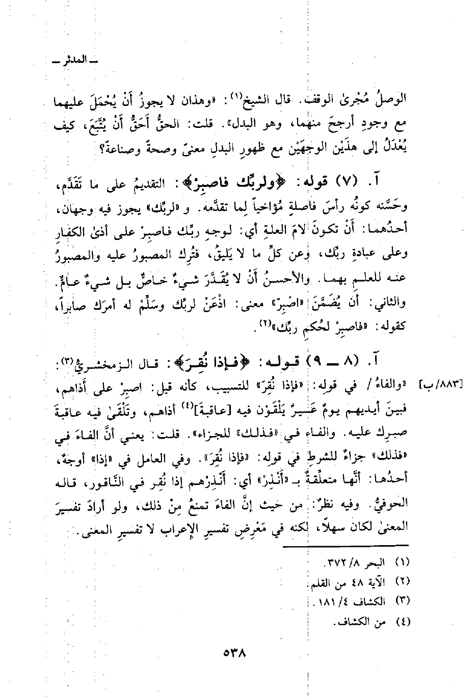 قوله: {فَإِذَا نُقِرَ} : قال الزمخشريُّ: «والفاءُ/ في قولِه:» فإذا نُقِرَ «للتسبيب، كأنه قيل: اصبِرْ على أَذاهم، فبينَ أيديهم يومٌ عَسيرٌ يَلْقَوْن فيه [عاقبةَ] أذاهم، وتَلْقَى فيه عاقبةَ صبرِك عليه. والفاء في» فذلك «للجزاء» . قلت: يعني أنَّ الفاءَ في «فذلك» جزاءٌ للشرطِ في قولِه: «فإذا نُقِرَ» . وفي العامل في «إذا» أوجهٌ، أحدُها: أنَّها متعلِّقةٌ ب «أَنْذِرْ» أي: أَنْذِرْهم إذا نُقِر في النَّاقور، قاله الحوفيُّ. وفيه نظرٌ: من حيث إنَّ الفاءَ تمنعُ مِنْ ذلك، ولو أرادَ تفسيرَ المعنى لكان سهلاً، لكنه في مَعْرِضِ تفسيرِ الإِعراب لا تفسيرِ المعنى.