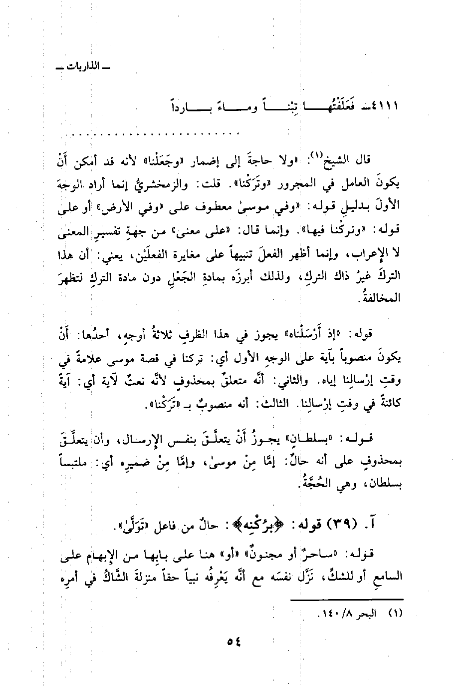 قال الشيخ:» ولا حاجةَ إلى إضمار «وجَعَلْنا» لأنه قد أمكن أَنْ يكونَ العامل في المجرور «وتَرَكْنا» . قلت: والزمخشريُّ إنما أراد الوجهَ الأولَ بدليلِ قوله: «وفي موسى معطوفٌ على» وفي الأرض «أو على قوله:» وتركْنا فيها «. وإنما قال:» على معنى «من جهةِ تفسيرِ المعنى لا الإِعراب، وإنما أظهر الفعلَ تنبيهاً على مغايرة الفعلَيْن. يعني: أن هذا التركَ غيرُ ذاك التركِ، ولذلك أبرزَه بمادةِ الجَعْلِ دون مادة التركِ لتظهرَ المخالفةُ.