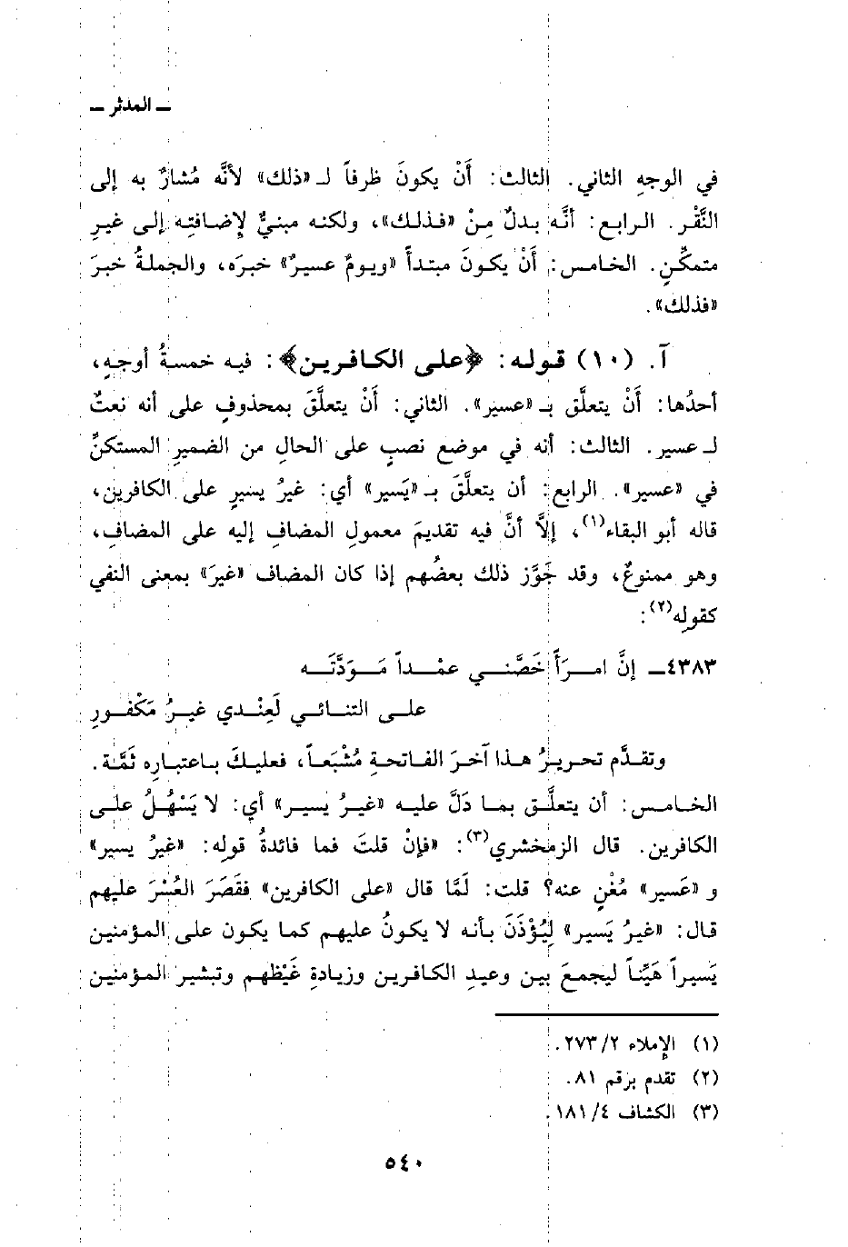 وتقدَّم تحريرُ هذا آخرَ الفاتحةِ مُشْبَعاً، فعليكَ باعتبارِه ثَمَّة. الخامس: أن يتعلَّق بما دَلَّ عليه «غيرُ يسير» أي: لا يَسْهُلُ على الكافرين. قال الزمخشري: «فإنْ قلتَ فما فائدةُ قولِه:» غيرُ يسير «و» عَسير «مُغْنٍ عنه؟ قلت: لَمَّا قال» على الكافرين «فقَصَرَ العُسْرَ عليهم قال:» غيرُ يَسير «لِيُؤْذَنَ بأنه لا يكونُ عليهم كما يكون على المؤمنين يَسيراً هَيِّناً ليجمعَ بين وعيدِ الكافرين وزيادةِ غَيْظهم وتبشير المؤمنين