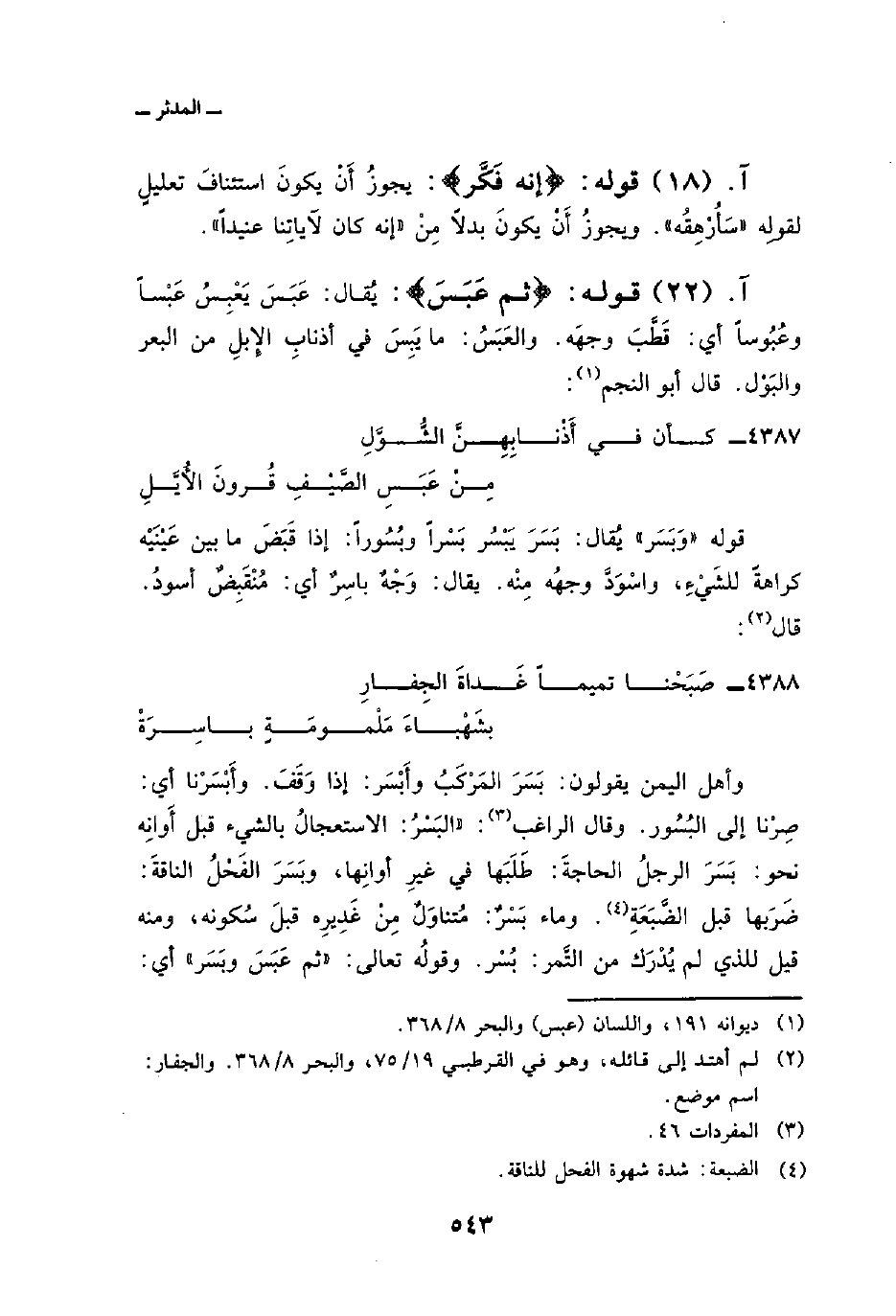 قوله: {ثُمَّ عَبَسَ} : يُقال: عَبَسَ يَعْبِسُ عَبْساً وعُبُوساً أي: قَطَّبَ وجهَه. والعَبَسُ: ما يَبِسَ في أذنابِ الإِبلِ من البعر والبَوْل. قال أبو النجم: