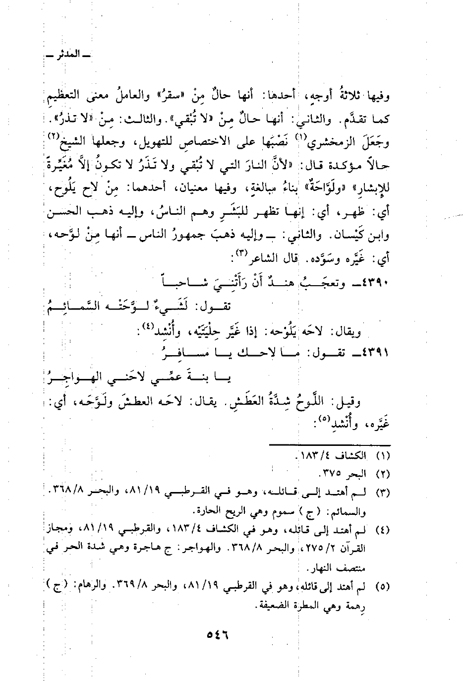 وفيها ثلاثةُ أوجهٍ، أحدها: أنها حالٌ مِنْ «سقرُ» والعاملُ معنى التعظيمِ كما تقدَّم. والثاني: أنها حالٌ مِنْ «لا تُبْقي» . والثالث: مِنْ «لا تذرُ» . وجَعَلَ الزمخشري نَصْبَها على الاختصاصِ للتهويل، وجعلها الشيخ حالاً مؤكدة قال: «لأنَّ النارَ التي لا تُبْقي ولا تَذَرُ لا تكونُ إلاَّ مُغَيِّرةً للإِبشارِ» «ولَوَّاحَةٌ» بناءُ مبالغةٍ، وفيها معنيان، أحدهما: مِنْ لاح يَلُوح، أي: ظهر، أي: إنها تظهر للبَشَرِ وهم الناسُ، وإليه ذهب الحسن وابن كَيْسان. والثاني: - وإليه ذهبَ جمهورُ الناس أنها مِنْ لوَّحه، أي: غَيَّره وسَوَّده. قال الشاعر: