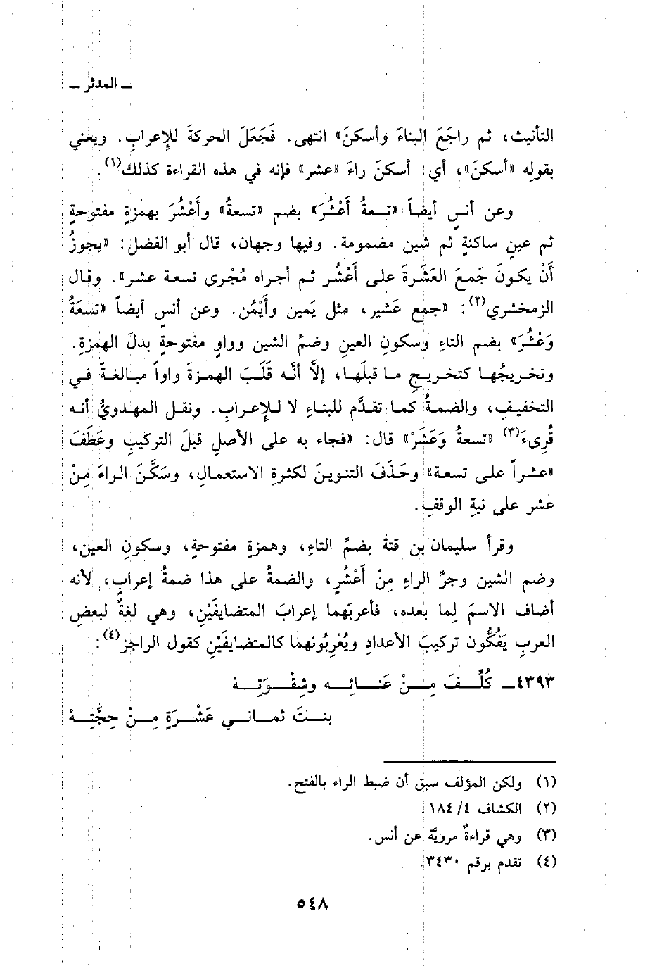 وقرأ سليمان بن قتة بضمِّ التاءِ، وهمزةٍ مفتوحةٍ، وسكونِ العين، وضم الشين وجرِّ الراءِ مِنْ أَعْشُرٍ، والضمةُ على هذا ضمةُ إعرابٍ، لأنه أضاف الاسمَ لِما بعده، فأعربَهما إعرابَ المتضايفَيْنِ، وهي لغةٌ لبعضِ العربِ يَفُكُّون تركيبَ الأعدادِ ويُعْرِبُونهما كالمتضايفَيْنِ كقول الراجز: