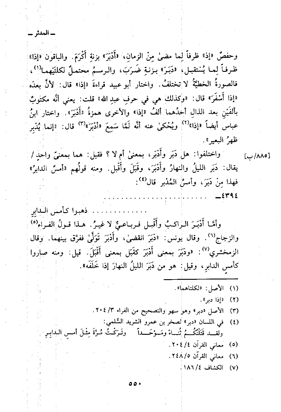 واختلفوا: هل دَبَر وأَدْبَر، بمعنى أم لا؟ فقيل: هما بمعنىً واحدٍ/ يقال: دَبَر الليلُ والنهارُ وأَدْبَرَ، وقَبَلَ وأَقْبل. ومنه قولُهم «أمسٌ الدابرُ» فهذا مِنْ دَبَرَ، وأمسٌ المُدْبر قال:
