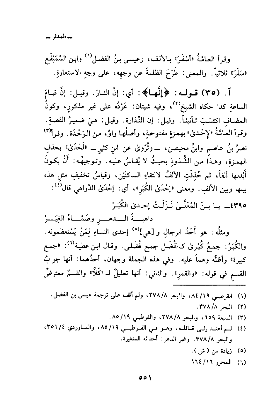 ومثلُه: هو أَحَدُ الرجالِ و [هي] إحدى النساءِ لِمَنْ يَسْتعظمونه. والكُبَرُ: جمعُ كُبْرى كالفُضَل جمع فُضْلى. وقال ابن عطية: «جمع كبيرة» وأظنُّه وهماً عليه. وفي هذه الجملة وجهان، أحدُهما: أنها جوابُ القسمِ في قوله: «والقمرِ» . والثاني: أنها تعليلٌ ل «كَلاَّ» والقسمٌ معترضٌ
