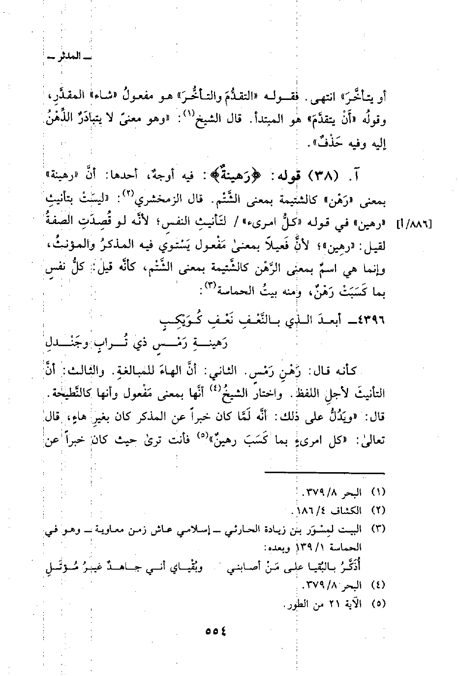 قوله: {رَهِينَةٌ} : فيه أوجهٌ، أحدها: أنَّ «رهينة» بمعنى «رَهْن» كالشتيمة بمعنى الشَّتْم. قال الزمخشري: «ليسَتْ بتأنيثِ» رهين «في قوله» كلُّ امرىء «/ لتَأنيثِ النفسِ؛ لأنَّه لو قُصِدَتِ الصفةُ لقيل:» رِهين «؛ لأنَّ فَعيلاً بمعنى مَفْعول يَسْتوي فيه المذكرُ والمؤنثُ، وإنما هي اسمٌ بمعنى الرَّهْن كالشَّتيمة بمعنى الشَّتْم، كأنه قيل: كلُّ نفسٍ بما كَسَبَتْ رَهْنٌ، ومنه بيتُ الحماسة:
