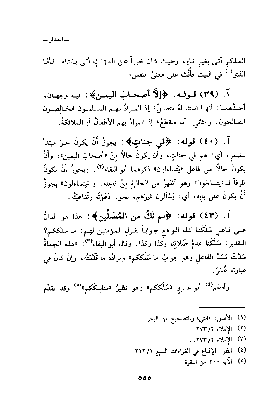 قوله: {إِلاَّ أَصْحَابَ اليمين} : فيه وجهان، أحدُهما: أنها استثناءٌ متصلٌ؛ إذ المرادُ بهم المسلمون الخالِصون الصالحون. والثاني: أنه منقطعٌ؛ إذ المرادُ بهم الأطفالُ أو الملائكةُ.