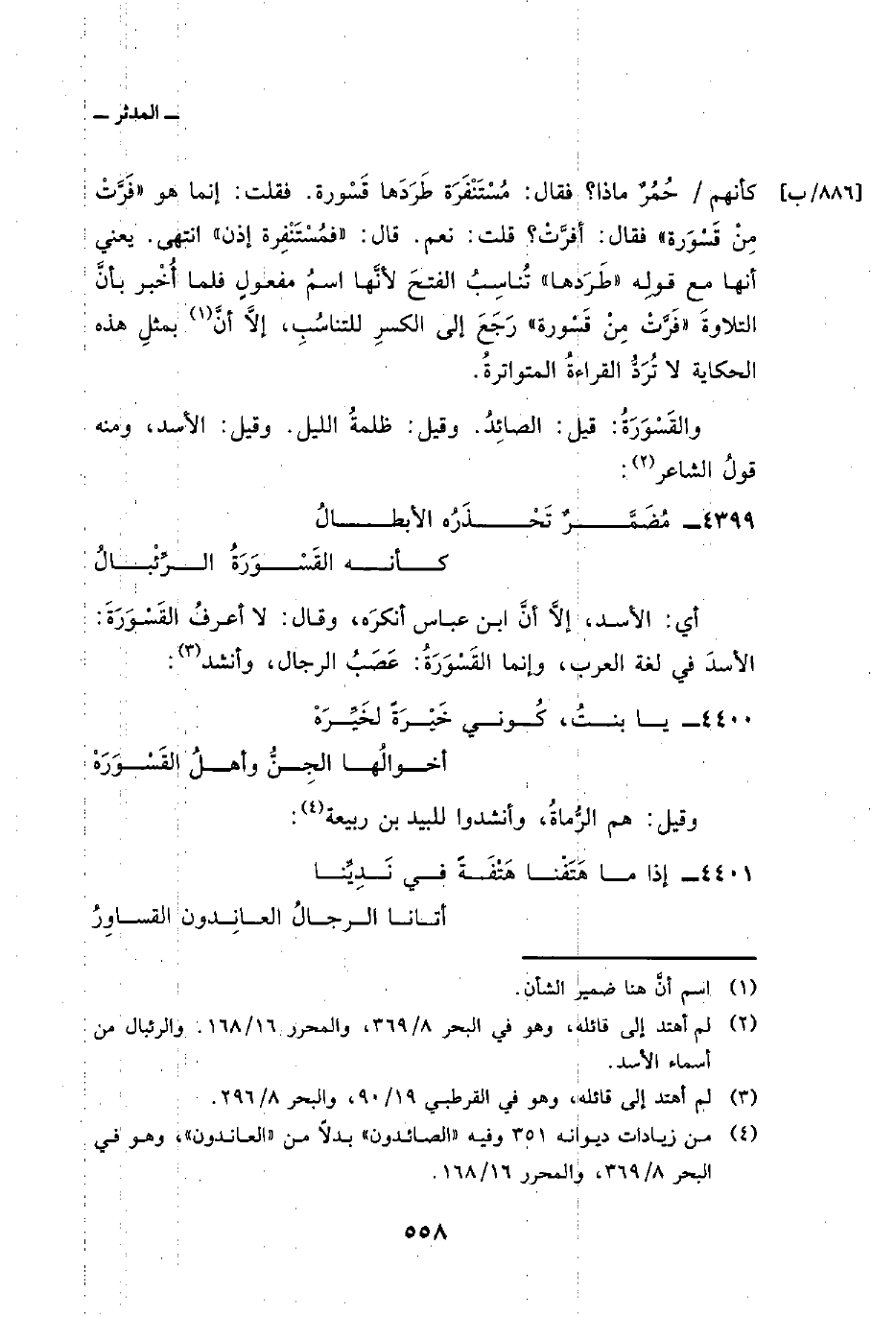 أي: الأسد، إلاَّ إنَّ ابن عباس أنكرَه، وقال: لا أعرفُ القَسْوَرَةَ: الأسدَ في لغة العرب، وإنما القَسْوَرَةُ: عَصَبُ الرجال، وأنشد: