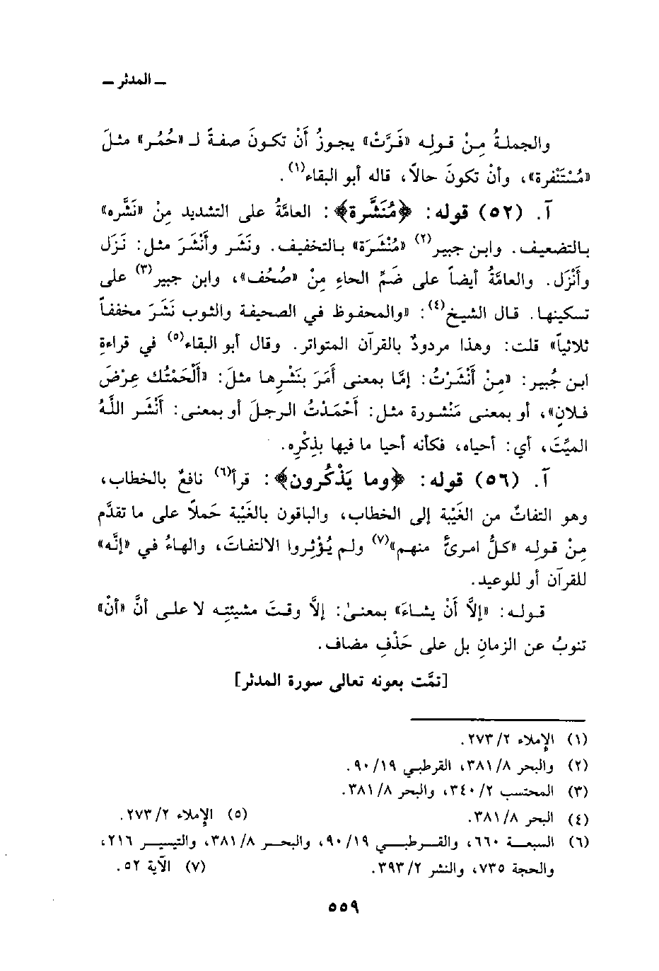 قوله: {مُّنَشَّرَةً} : العامَّةُ على التشديد مِنْ «نَشَّره» بالتضعيف. وابن جبير «مُنْشَرَة» بالتخفيف. ونَشَر وأَنْشَرَ مثل: نَزَل وأَنْزَل. والعامَّةُ أيضاً على ضَمِّ الحاءِ مِنْ «صُحُف» ، وابن جبير على تكسينها، قال الشيخ: «والمحفوظ في الصحيفة والثوب نَشَرَ مخففاً ثلاثياً» قلت: وهذا مردودٌ بالقرآن المتواتر. وقال أبو البقاء في قراءةِ ابن جُبير: «مِنْ أَنْشَرْتُ: إمَّا بمعنى أَمَرَ بنَشْرِها مثلَ:» أَلْحَمْتُك عِرْضَ فلانٍ «، أو بمعنى مَنْشورة مثل: أَحْمَدْتُ الرجلَ أو بمعنى: أَنْشَر اللَّهُ الميِّتَ، أي: أحياه، فكأنه أحيا ما فيها بذكْرِه.