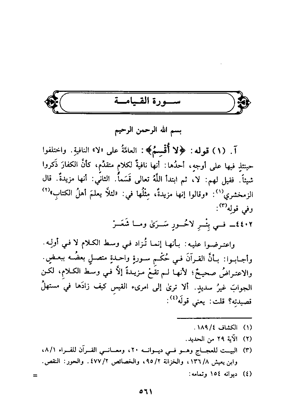 4402 - في بِئْرِ لاحُورٍ سَرَى وما شَعَرْ ... واعترضوا عليه: بأنها إنما تُزاد في وسط الكلام لا في أولِه. وأجابوا: بأنَّ القرآنَ في حُكْمِ سورةٍ واحدةٍ متصلٍ بعضُه ببعضٍ. والاعتراضُ صحيحٌ؛ لأنها لم تقَعْ مزيدةً إلاَّ في وسط الكلامِ، لكن الجوابَ غيرُ سديدٍ. ألا ترى إلى امرىء القيسِ كيف زادَها في مستهلِّ قصيدتِه؟ قلت: يعني قولَه: