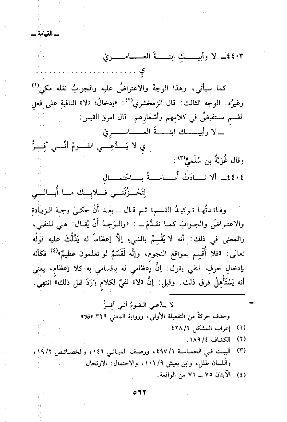 كما سيأتي، وهذا الوجهُ والاعتراضُ عليه والجوابُ نقله مكي وغيرُه. الوجه الثالث: قال الزمخشري:» إدخالُ «» لا «النافيةِ على فعلِ القسمِ مستفيضٌ في كلامِهم وأشعارِهم. قال امرؤ القيس: