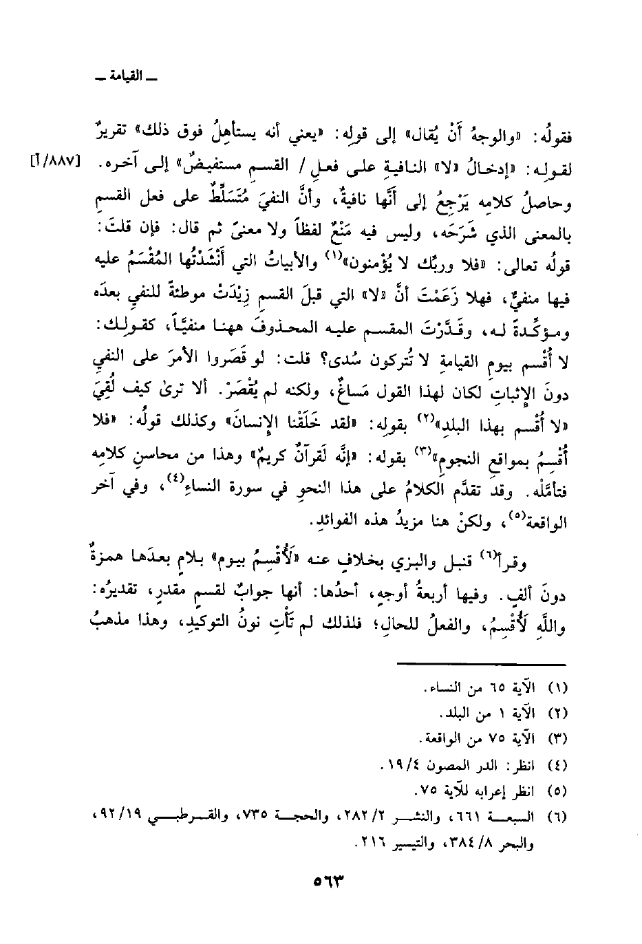 فقولُه:» والوجهُ أَنْ يُقال «إلى قولِه:» يعني أنه يستأهِلُ فوق ذلك «تقريرٌ لقولِه:» إدخالُ «لا» النافيةِ على فعلِ/ القسمِ مستفيضٌ «إلى آخره. وحاصلُ كلامِه يَرْجِعُ إلا أَنَّها نافيةٌ، وأنَّ النفيَ مُتَسَلِّطٌ على فعل القسمِ بالمعنى الذي شَرَحَه، وليس فيه مَنْعٌ لفظاً ولا معنىً ثم قال: فإن قلتَ: قولُه تعالى: {فَلاَ وَرَبِّكَ لاَ يُؤْمِنُونَ} [النساء: 65] والأبياتُ التي أَنْشَدْتُها المُقْسَمُ عليه فيها منفيٌّ، فهلا زَعَمْتَ أنَّ» لا «التي قبلَ القسمِ زِيْدَتْ موطئةً للنفيِ بعدَه ومؤكِّدةً له، وقَدَّرْتَ المقسم عليه المحذوفَ ههنا منفيَّاً، كقولِك: لا أُقْسم بيومِ القيامةِ لا تُتركون سُدى؟ قلت: لو قَصَروا الأمرَ على النفيِ دونَ الإِثباتِ لكان لهذا القول مَساغٌ، ولكنه لم يُقْصَرْ. ألا ترى كيف لُقِيَ {لاَ أُقْسِمُ بهذا البلد} [البلد: 1] بقولِه: {لَقَدْ خَلَقْنَا الإنسان} وكذلك قولُه: {فَلاَ أُقْسِمُ بِمَوَاقِعِ النجوم} [الواقعة: 75] بقوله: {إِنَّهُ لَقُرْآنٌ كَرِيمٌ} وهذا من محاسنِ كلامِه فتأمَّلْه. وقد تقدَّم الكلامُ على هذا النحوِ في سورة النساءِ، وفي آخر الواقعة، ولكنْ هنا مزيدُ هذه الفوائدِ.