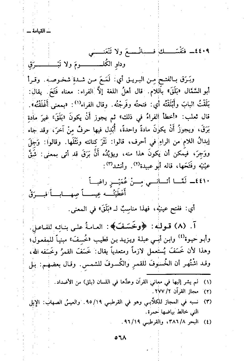 وبَرَق بالفتح مِن البريق أي: لَمَعَ من شدةِ شخوصه. وقرأ أبو السَّمَّال «بَلَقَ» باللام. قال أهلُ اللغة إلاَّ الفراء. معناه فَتَحَ. يقال: بَلَقْتُ البابَ وأَبْلَقْتُه أي: فتحتُه وفَرجْتُه. وقال الفراء: «بمعنى أَغْلَقْتُه» . قال ثعلب: «أخطأ الفراءُ في ذلك» ثم يجوز أَنْ يكونَ «بَلَقَ» غيرَ مادةِ بَرَقَ، ويجوزُ أَنْ يكونَ مادةً واحدةً، أُبْدِل فيها حرفٌ مِنْ آخرَ، وقد جاء إبدالُ اللامِ من الراءِ في أحرف، قالوا: نَثَرَ كِنانته ونَثَلَها. وقالوا: وَجِلَ ووَجِرَ، فيمكن أن يكونَ هذا منه، ويؤيِّدُه أَنَّ بَرَقَ قد أتى بمعنى: شَقَّ عيْنيْه وفَتَحَها، قاله أبو عبيدة. وأنشد: