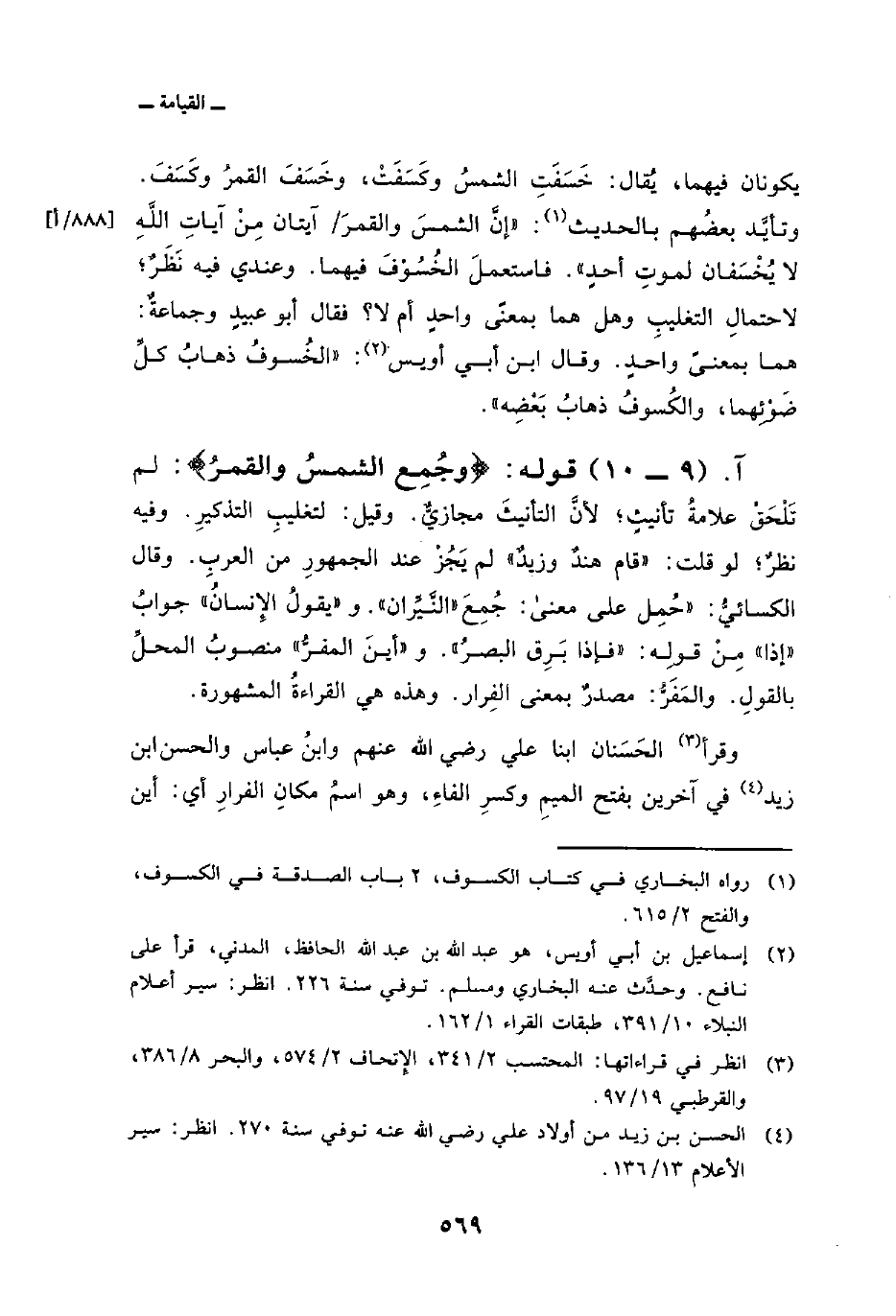 يكونان فيهما، يُقال: خَسَفَتِ الشمسُ وكَسَفَتْ، وخَسَفَ القمرُ وكَسَفَ. وتأيَّد بعضُهم بالحديث: «إنَّ الشمسَ والقمرَ/ آيتان مِنْ آياتِ اللَّهِ لا يُخْسَفان لموتِ أحدٍ» فاستعملَ الخُسُوْفَ فيهما. وعندي فيه نَظَرٌ؛ لاحتمالِ التغليبِ وهل هما بمعنىً واحدٍ أم لا؟ فقال أبو عبيدٍ وجماعةٌ: هما بمعنىً واحدٍ. وقال ابن أبي أويس: «الخُسوفُ ذهابُ كلِّ ضَوْئِهما، والكُسوفُ ذهابُ بَعْضِه» .
