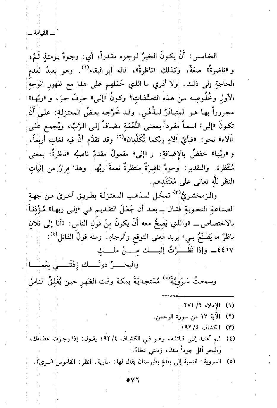 والزمخشريُّ تمحَّل لمذهب المعتزلة بطريق أخرى من جهةِ الصناعةِ النحويةِ فقال بعد أن جَعَلَ التقديمِ في «إلى ربها» مُؤْذِناً بالاختصاص «والذي يَصِحُّ معه أَنْ يكونَ مِنْ قولِ الناس:» أنا إلى فلانٍ ناظرٌ ما يَصْنَعُ بي «يريد معنى التوقعِ والرجاءِ. ومنه قولُ القائل: