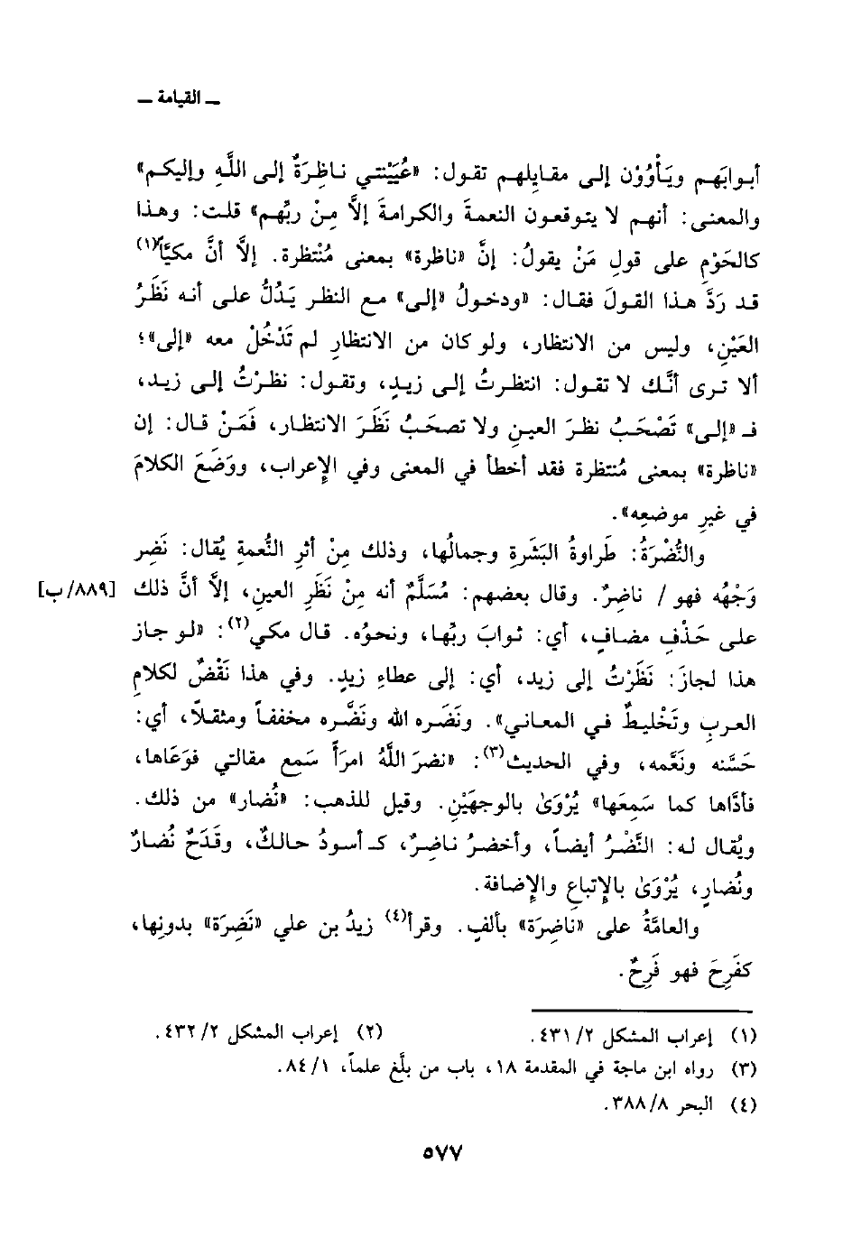 أبوابَهم ويَأْوُوْن إلى مقايِلهم تقول:» عُيَيْنتي ناظِرَةٌ إلى اللَّهِ وإليكم «والمعنى: أنهم لا يتوقعون النعمةَ والكرامةَ إلاَّ مِنْ ربِّهم» قلت: وهذا كالحَوْمِ على قولِ مَنْ يقولُ: إنَّ «ناظرة» بمعنى مُنْتظرة. إلاَّ أنَّ مكيَّاً قد رَدَّ هذا القولَ فقال: «ودخولُ» إلى «مع النظر يَدُلُّ على أنه نَظَرُ العَيْنِ، وليس من الانتظار، ولو كان من الانتظارِ لم تَدْخُلْ معه» إلى «؛ ألا ترى أنَّك لا تقول: انتظرتُ إلى زيدٍ، وتقول: نظرْتُ إلى زيد، ف» إلى «تَصْحَبُ نظرَ العينِ لا تصحَبُ نَظَرَ الانتظار، فَمَنْ قال: إن» ناظرة «بمعنى مُنتظرة فقد أخطأ في المعنى وفي الإِعراب، ووَضَعَ الكلامَ في غيرِ موضعِه» .