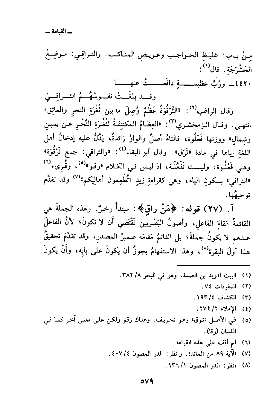 وقال الراغب: «التَّرْقُوَةُ عَظْمٌ وُصِلَ ما بين ثُغْرَةِ النحرِ والعاتِق» انتهى. وقال الزمخشري: «العِظامُ المكتنِفةُ لثُغْرَةِ النَّحْرِ عن يمينٍ وشِمالٍ» ووزنها فَعْلُوة، فالتاءُ أصلٌ والواوُ زائدةٌ، يَدُلُّ عليه إدخالُ أهل اللغةِ إياها في مادة «تَرَق» . وقال أبو البقاء: «والتراقي: جمع تَرْقُوَة» وهي فَعْلُوة، وليست تَفْعُلَة، إذ ليس في الكلام «رقو» ، وقُرِىء «التراقي» بسكونِ الياء، وهي كقراءةِ زيدٍ «تُطْعِمون أهالِيْكم» [المائدة: 89] وقد تقدَّم توجيهُها.