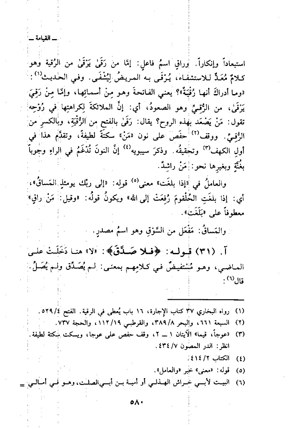 استبعاداً وإنكاراً. وراقٍ اسمُ فاعلٍ: إمَّا من رَقَى يَرْقَى من الرُقية وهو كلامٌ مُعَدٌّ للاستشفاء، يُرْقَى به المريضُ لِيُشْفَى. وفي الحديث: «وما أدراكَ أنها رُقْيَةٌ» ؟ يعني الفاتحةَ وهو مِنْ أسمائِها، وإمَّا مِنْ رَقِيَ يَرْقَى، من الرُّقِيِّ وهو الصعودُ، أي: إنَّ الملائكةَ لِكراهتِها في رُوْحِه تقول: مَنْ يَصْعَد بهذه الروح؟ يقال: رَقَى بالفتحِ من الرُّقْيَةِ، وبالكسرِ من الرُّقِيِّ. ووقف حفَص على نون «مَنْ» سكتَةً لطيفةً، وتقدَّم هذا في أولِ الكهف وتحقيقُه. وذكرَ سيبويه إنَّ النونَ تُدْغَمُ في الراءِ وجوباً بغُنَّةٍ وبغيرِها نحو: مَنْ راشِدٌ.