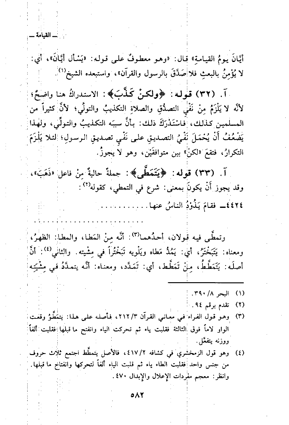 أَيَّانَ يَوْمُ القيامة} قال:» وهو معطوفٌ على قوله: «يَسْأل أيَّان» ، أي: لا يُؤْمِنُ بالبعثِ فلا صَدَّقَ بالرسول والقرآن «، واستبعده الشيخ.