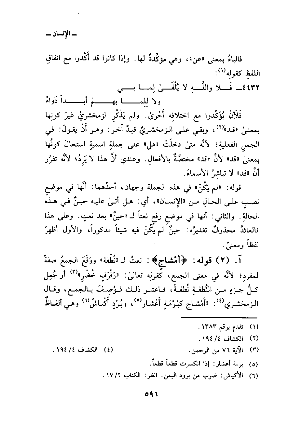 قوله: {لَمْ يَكُن} في هذه الجملة وجهان، أحدُهما: أنَّها في موضعِ نصبٍ على الحالِ من «الإِنسان» ، أي: هل أتى عليه حينٌ في هذه الحالةِ. والثاني: أنها في موضعِ رفع نعتاً ل «حينٌ» بعد نعتٍ. وعلى هذا فالعائدُ تقديرُه: حينٌ لم يكُنْ فيه شيئا مذكوراً، والأول أظهرُ لفظاً ومعنىً.