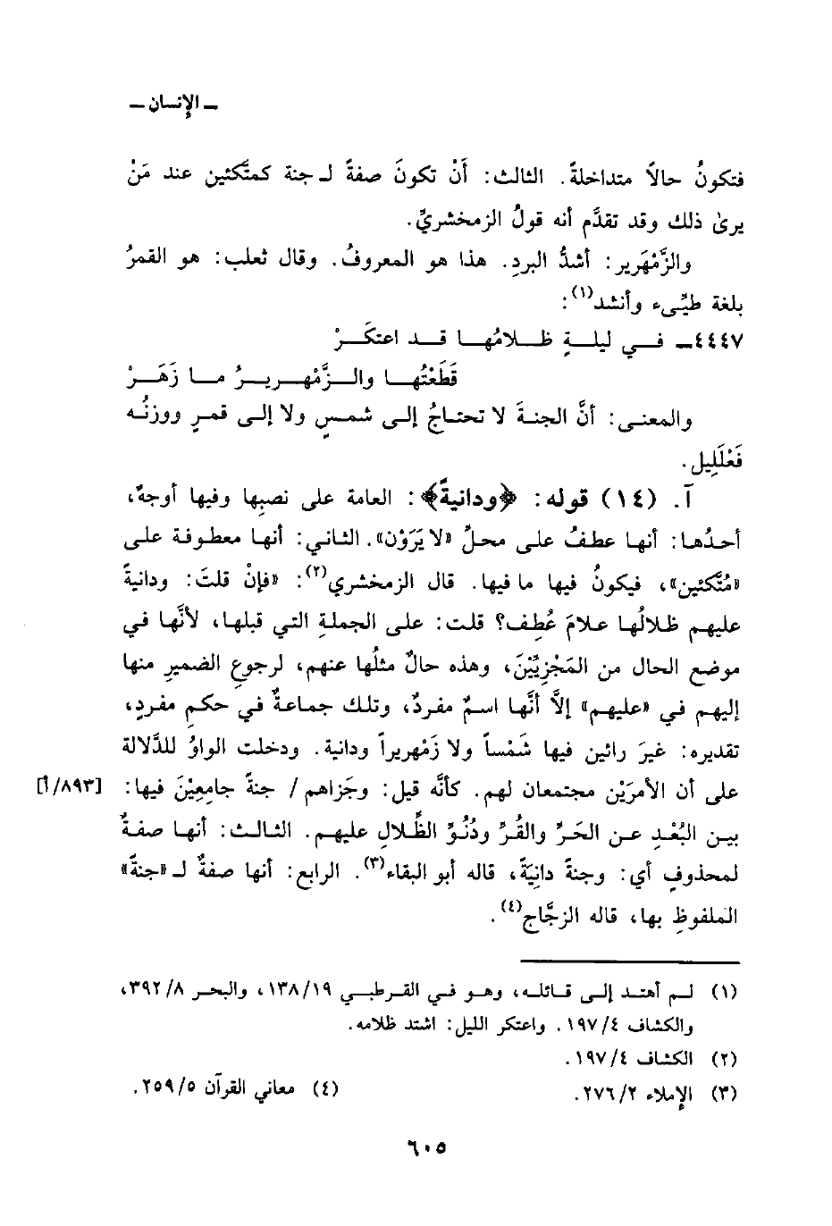 قوله: {وَدَانِيَةً} : العامة على نصبِها وفيها أوجهٌ، أحدُها: أنها عطفُ على محلِّ «لا يَرَوْن» . الثاني: أنها معطوفة على «مُتَّكئين» ، فيكونُ فيها ما فيها. قال الزمخشري: «فإنْ قلتَ: ودانيةً عليهم ظلالُها علامَ عُطِف؟ قلت: على الجملةِ التي قبلها، لأنَّها في موضع الحال من المَجْزِيِّيْنَ، وهذه حالٌ مثلُها عنهم، لرجوعِ الضميرِ منها إليهم في» عليهم «إلاَّ أنَّها اسمٌ مفردٌ، وتلك جماعةٌ في حكمِ مفردٍ، تقديره: غيرَ رائين فيها شَمْساً ولا زَمْهريراً ودانية. ودخلت الواوُ للدَّلالة على أن الأمرَيْن مجتمعان لهم. كأنَّه قيل: وجَزاهم/ جنةً جامِعِيْنَ فيها: بين البُعْدِ عن الحَرِّ والقُرِّ ودُنُوِّ الظِّلالِ عليهم. الثالث: أنها صفةٌ لمحذوفٍ أي: وجنةً دانِيَةً، قاله أبو البقاء. الرابع: أنها صفةٌ ل» جنةٌ «الملفوظِ بها، قاله الزجَّاج.