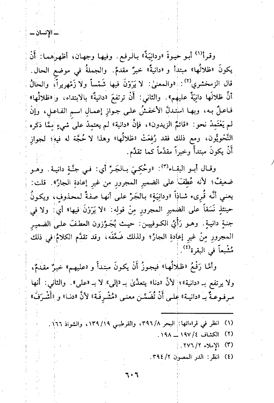 وأمَّا رَفْعُ» ظلالُها «فيجوزُ أَنْ يكونَ مبتدأً و» عليهم «خبرٌ مقدمٌ، ولا يرتفع ب» دانية «؛ لأنَّ» دنا «يتعدَّى ب» إلى «لا ب» على «. والثاني: أنها مرفوعةٌ ب» دانية «على أَنْ تُضَمَّن معنى» مُشْرِفَة «لأنَّ» دنا «و» أَشْرَفَ «