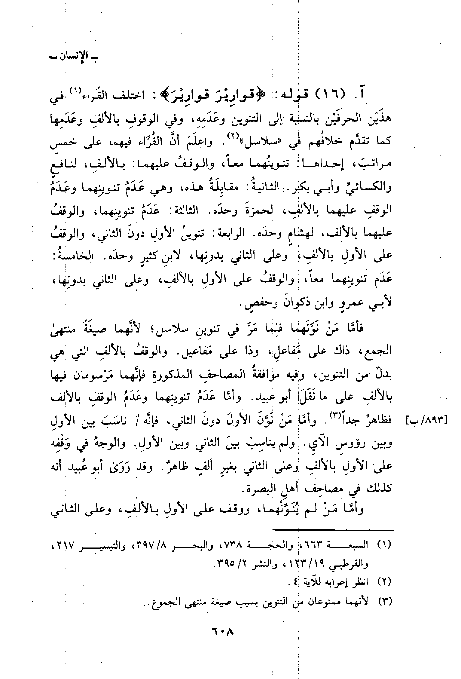 فأمَّا مَنْ نَوَّنَهما فلِما مَرَّ في تنوينِ سلاسل؛ لأنَّهما صيغَةُ منتهى الجمع، ذاك على مَفاعلِ، وذا على مَفاعيل. والوقفُ بالألفِ التي هي بدلٌ من التنوين، وفيه موافقةُ المصاحفِ المذكورةِ فإنَّهما مَرْسومان فيها بالألفِ على ما نَقَلَ أبو عبيد. وأمَّا عَدَمُ تنوينِهما وعَدَمُ الوقفِ بالألف فظاهرٌ جداً. وأمَّا مَنْ نَوَّنَ الأولَ دونَ الثاني، فإنَّه/ ناسَبَ بين الأولِ وبين رؤوسِ الآيِ. ولم يناسِبْ بينَ الثاني وبين الأولِ. والوجهُ في وَقْفِه على الأولِ بالألفِ وعلى الثاني بغيرِ ألفٍ ظاهرٌ. وقد رَوَى أبو عُبيد أنه كذلك في مصاحِف أهلِ البصرة.