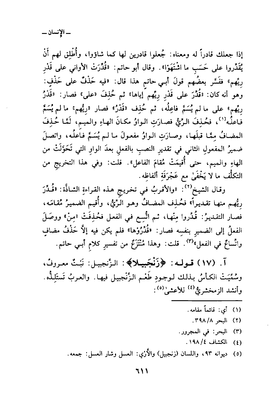 قوله: {زَنجَبِيلاً} : الزَّنجبيل: نَبْتٌ معروفٌ، وسُمِّيَتْ الكأسُ بذلك لوجودِ طَعْم الزَّنْجبيل فيها. والعربُ تَستَلِذُّه. وأنشد الزمخشريُّ للأعشى: