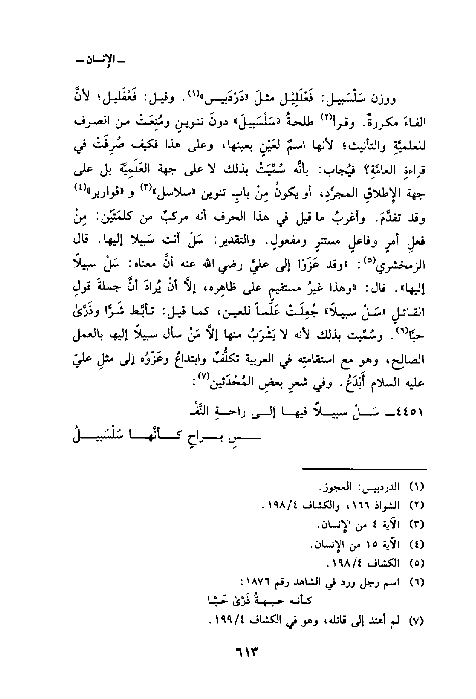 ووزن سَلْسَبيل: فَعْلَلِيْل مثلَ «دَرْدَبيس» . وقيل: فَعْفَليل؛ لأنَّ الفاءَ مكررةٌ. وقرأ طلحةُ «سَلْسَبيلَ» دونَ تنوينٍ ومُنِعَتْ من الصرف للعلميَّةِ والتأنيث؛ لأنها اسمٌ لعَيْنٍ بعينها، وعلى هذا فكيف صُرِفَتْ في قراءةِ العامَّةِ؟ فيُجاب: بأنُّه سُمِّيَتْ بذلك لا على جهة العَلَمِيَّة بل على جهة الإطلاقِ المجرَّدِ، أو يكونُ مِنْ بابِ تنوين {سَلاَسِلَ} [الإِنسان: 4] {قَوَارِيرَاْ} [الإِنسان: 15] وقد تقدَّمَ. وأغربُ ما قيل في هذا الحرف أنه مركبٌ من كلمَتَيْن: مِنْ فعلِ أمرٍ وفاعلٍ مستترٍ ومفعولٍ. والتقدير: سَلْ أنت سَبيلا إليها. قال الزمخشري: «وقد عَزَوْا إلى عليٍّ رضي الله عنه أنَّ معناه: سَلْ سبيلاً إليها» . قال: «وهذا غيرُ مستقيمٍ على ظاهِره، إلاَّ أنْ يُرادَ أنَّ جملةَ قولِ القائلِ» سَلْ سبيلاً «جَعِلَتْ عَلَماً للعين، كما قيل: تأبَّط شَرَّاً وذَرَّى حبَّا. وسُمِّيت بذلك لأنه لا يَشْرَبُ منها إلاَّ مَنْ سأل سبيلاً إليها بالعمل الصالِح، وهو مع استقامتِه في العربية تكلُّفٌ وابتداعٌ وعَزْوُه إلى مثلِ عليّ عليه السلام أَبْدَعُ. وفي شعرِ بعضِ المُحْدَثين: