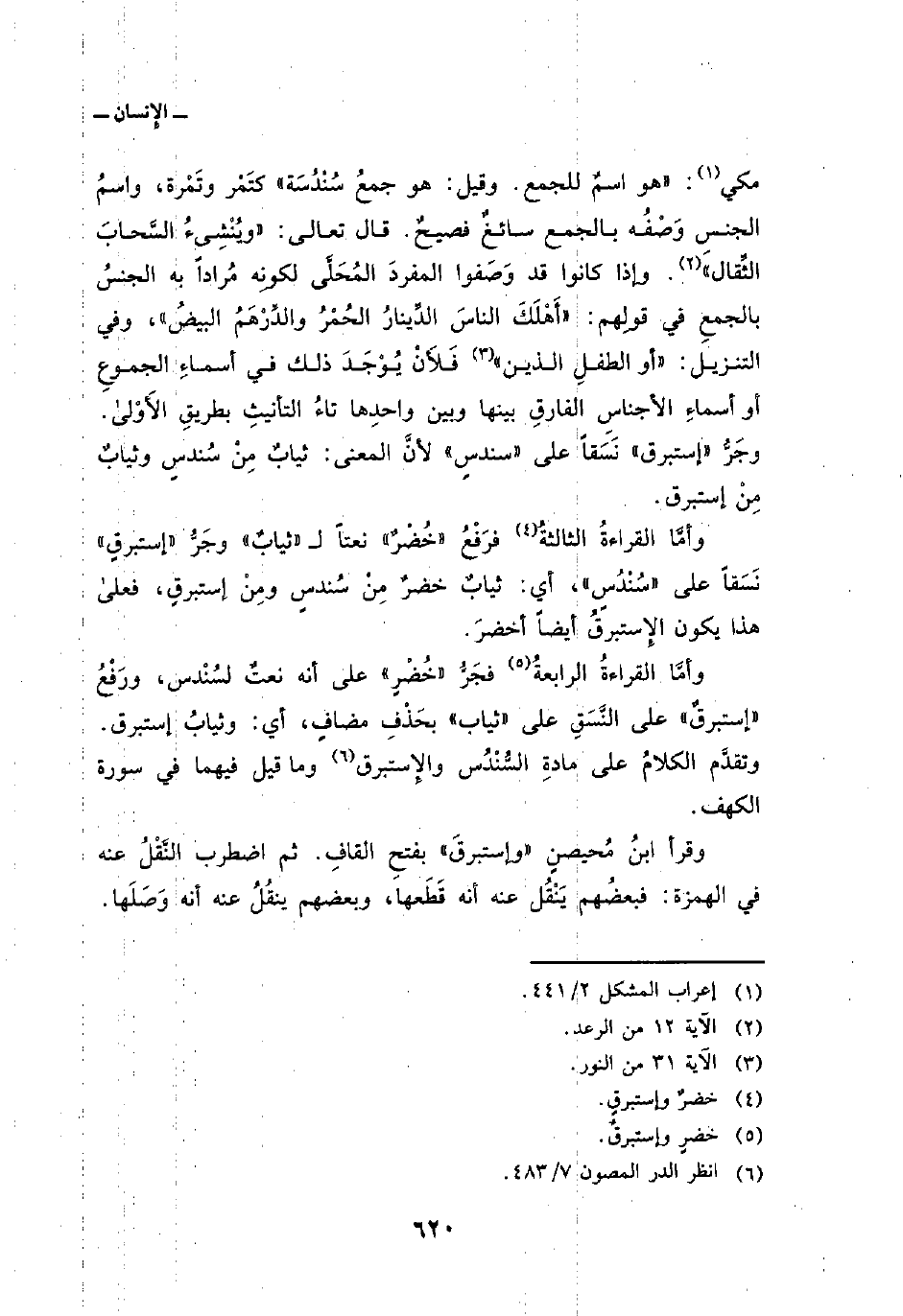 مكي: «هو اسمٌ للجمع. وقيل: هو جمعُ سُنْدُسَة» كتَمْر وتَمْرة، واسمُ الجنسِ وَصْفُه بالجمع سائغٌ فصيحٌ. قال تعالى: {وَيُنْشِىءُ السحاب الثقال} [الرعد: 12] . وإذا كانوا قد وَصَفوا المفردَ المُحَلَّى لكونِه مُراداً به الجنسُ بالجمعِ في قولِهم: «أَهْلَكَ الناسَ الدِّينارُ الحُمْرُ والدِّرْهَمُ البيضُ» ، وفي التنزيل: {أَوِ الطفل الذين} [النور: 31] فَلأَنْ يُوْجَدَ ذلك في أسماءِ الجموعِ أو أسماءِ الأجناسِ الفارقِ بينها وبين واحدِها تاءُ التأنيثِ بطريقِ الأَوْلى. وجَرُّ «إستبرق» نَسَقاً على «سندسٍ» لأنَّ المعنى: ثيابٌ مِنْ سُندسٍ وثيابٌ مِنْ إستبرق.