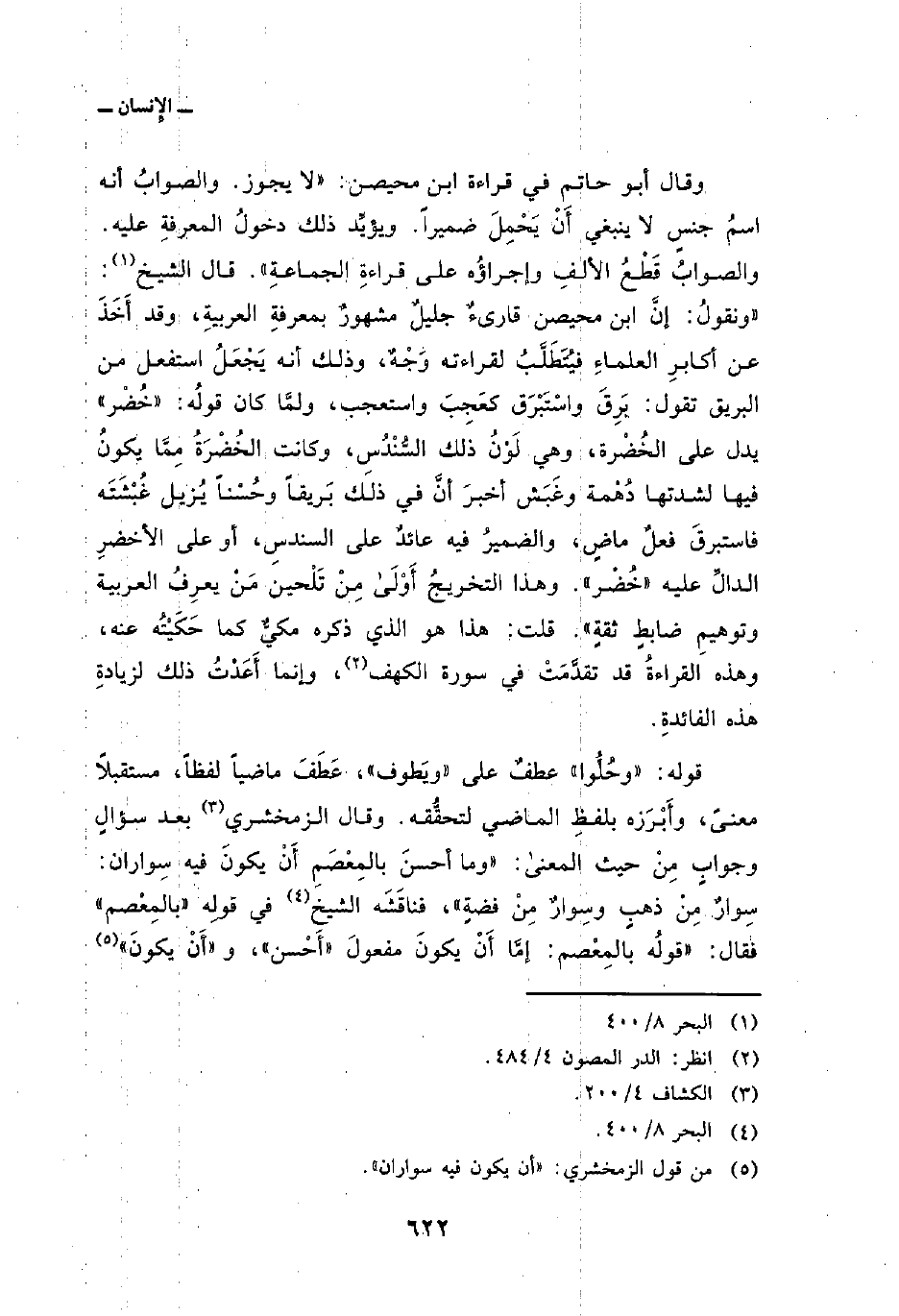 وقال أبو حاتم في قراءة ابن محيصن:» لا يجوز. والصوابُ أنه اسمُ جنسٍ لا ينبغي أَنْ يَحْمِلَ ضميراً، ويؤيِّد ذلك دخولُ المعرفةِ عليه. والثوابُ قَطْعُ الألفِ وإجراؤُه على قراءةِ الجماعةِ «. قال الشيخ:» ونقولُ: إنَّ ابن محيصن قارىءٌ جليلٌ مشهورٌ بمعرفةِ العربيةِ، وقد أَخَذَ عن أكابرِ العلماءِ فيُتَطَلَّبُ لقراءته وَجْهٌ، وذلك أنه يَجْعَلُ استفعل من البريق تقول: بَرِقَ واسْتَبْرَق كعَجِبَ واستعجب، ولمَّا كان قولُه: «خُضْر» يدل على الخُضْرة، وهي لَوْنُ ذلك السُّنْدُسِ، وكانت الخُضْرَةُ مِمَّا يكونُ فيها لشدتها دُهْمة وغَبَش أخبرَ أنَّ في ذلك بَريقاً وحُسْناً يُزيل غُبْشَتَه فاستبرق فعلٌ ماضٍ، والضميرُ فيه عائدٌ على السندسِ، أو على الأخضرِ الدالِّ عليه «خُضْر» . وهذا التخريجُ أَوْلَى مِنْ تَلْحين مَنْ يعرِفُ العربية وتوهيمِ ضابطٍ ثقةٍ «. قلت: هذا هو الذي ذكره مكيٌّ كما حَكَيْتُه عنه، وهذه القراءةُ قد تقدَّمَتْ في سورة الكهف، وإنما أَعَدْتُ ذلك لزيادةِ هذه الفائدةِ.