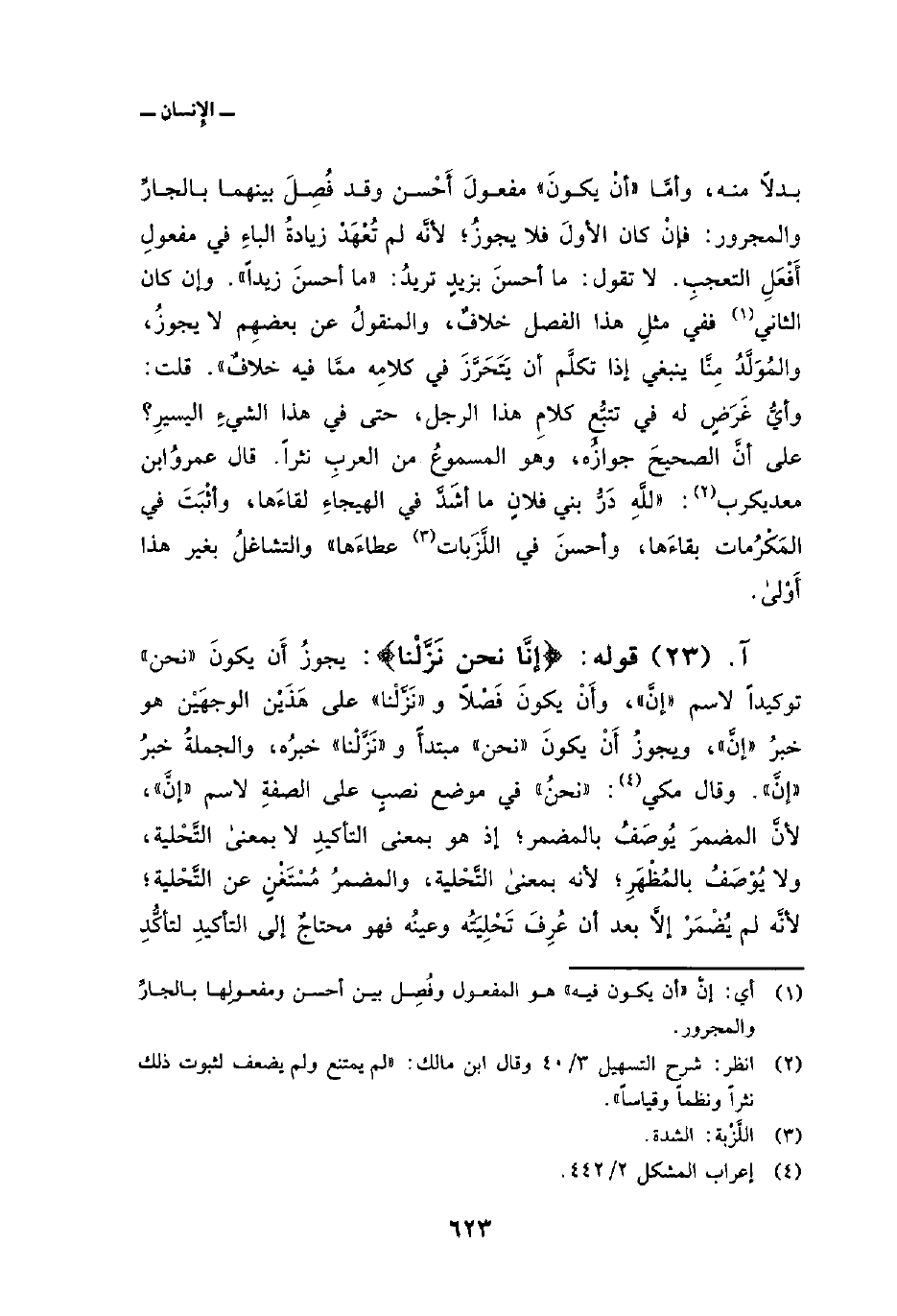 بدلاً منه، وأمَّا «أنْ يكونَ» مفعولَ أَحْسن وقد فُصِلَ بينهما بالجارِّ والمجرور: فإنْ كان الأولَ فلا يجوزُ؛ لأنَّه لم تُعْهَدْ زيادةُ الباءِ في مفعولِ أَفْعَلِ التعجبِ. لا تقول: ما أحسنَ بزيدٍ تريدُ: «ما أحسن زيداً» . وإن كان الثاني ففي مثلِ هذا الفصل خلافٌ، والمنقولُ عن بعضهِم لا يجوزُ، والمُوَلَّدُ مِنَّا ينبغي إذا تكلَّم أن يَتَحَرَّزَ في كلامِه ممَّا فيه خلافٌ «. قلت: وأيُّ غَرَضٍ له في تتبُّعٍ كلامِ هذا الرجل، حتى في هذا الشيءِ اليسيرِ؟ على أنَّ الصحيحَ جوازُه، وهو المسموعُ من العربِ نثراً. قال عمروُ ابن معديكرب:» للَّهِ دَرُّ بني فلانٍ ما أشَدَّ في الهيجاءِ لقاءَها، وأَثْبَتَ في المَكْرُمات بقاءَها، وأحسنَ في اللَّزَبات عطاءَها «والتشاغلُ بغير هذا أَوْلى.