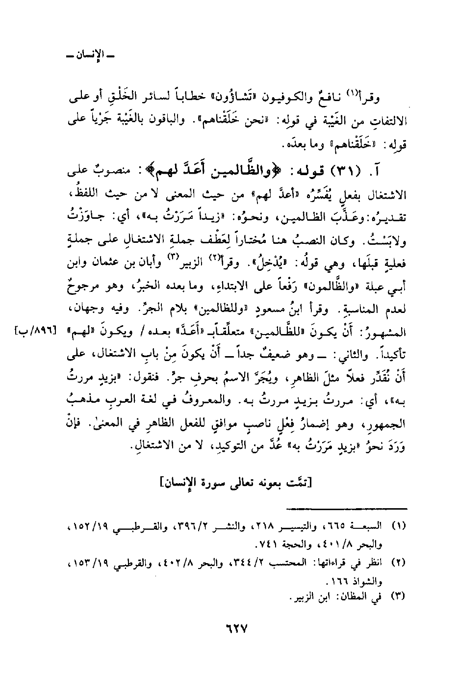 قوله: {والظالمين أَعَدَّ لَهُمْ} : منصوبٌ على الاشتغال بفعلٍ يُفَسِّرُه «أعدَّ لهم» من حيث المعنى لا من حيث اللفظُ، تقديرُه: وعَذَّبَ الظالمين، ونحوُه: «زيداً مَرَرْتُ به» ، أي: جاوَزْتُ ولابَسْتُ. وكان النصبُ هنا مُختاراً لِعَطْف جملةِ الاشتغالِ على جملةٍ فعليةٍ قبلَها، وهي قولُه: «يُدْخِلُ» . وقرأ الزبير وأبان بن عثمان وابن أبي عبلة «والظَّالمون» رَفْعاً على الابتداءِ، وما بعده الخبرُ، وهو مرجوحٌ لعدم المناسبةِ. وقرأ ابنُ مسعودٍ «وللظالمين» بلام الجرِّ. وفيه وجهان، المشهورُ: أَنْ يكونَ «للظَّالمين» متعلِّقاً ب «أَعَدَّ» بعده/ ويكونَ «لهم» تأكيداً. الثاني: وهو ضعيفٌ جداً أَنْ يكونَ مِنْ بابِ الاشغال، على أَنْ تُقَدِّر فعلاً مثلَ الظاهرِ، ويُجَرَّ الاسمُ بحرفِ جرٍّ. فنقول: «بزيدٍ مررتُ به» ، أي: مررتُ بزيدٍ مررتُ به. والمعروفُ في لغة العربِ مذهبُ الجمهورِ، وهو إضمارُ فِعْلٍ ناصبٍ موافقٍ للفعل الظاهرِ في المعنى. فإنْ وَرَدَ نحوُ «بزيدٍ مَرَرْتُ به» عُدَّ من التوكيدِ، لا من الاشتغالِ.