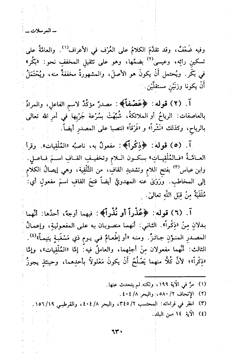قوله: {عُذْراً أَوْ نُذْراً} : فيهما أوجهٌ، أحدُها: أنَّهما بدلانِ مِنْ «ذِكْراً» . الثاني: أنهما منصوبان به على المفعوليةِ، وإعمالُ المصدرِ المنوَّنِ جائزٌ. ومنه {أَوْ إِطْعَامٌ فِي يَوْمٍ ذِي مَسْغَبَةٍ يَتِيماً} [البلد: 14 - 15] . الثالث: أنَّهما مفعولان مِنْ أجلِهما، والعاملُ فيه: إمَّا «المُلْقِيات» ، وإمَّا «ذِكْراً» ؛ لأنَّ كُلاًّ منهما يَصْلُحُ أَنْ يكونَ مَعْلولاً بأحدِهما، وحينئذٍ يجوزُ