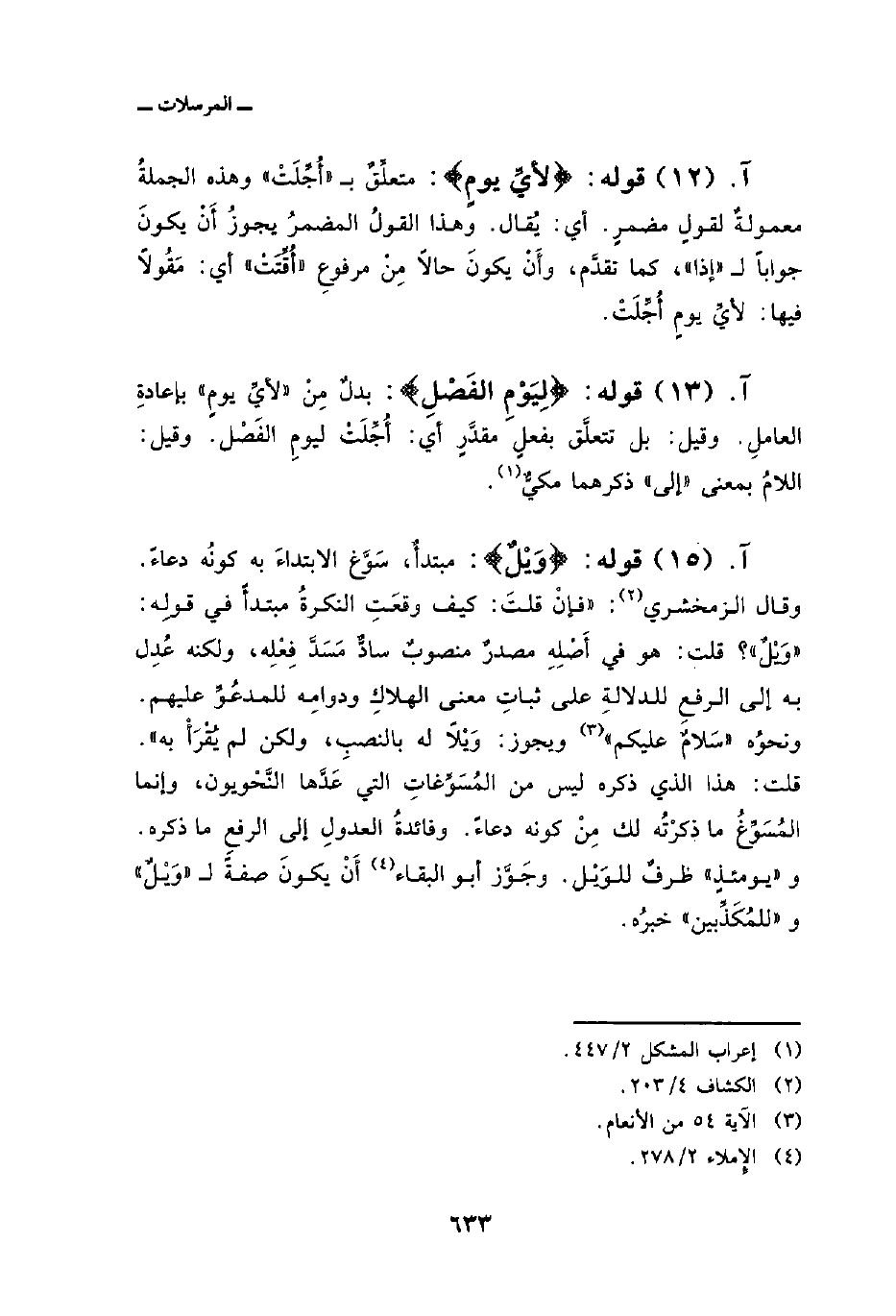 قوله: {وَيْلٌ} : مبتدأٌ، سَوَّغ الابتداءَ به كونُه دعاءً. وقال الزمخشري: «فإنْ قلتَ: كيف وقعَتِ النكرةُ مبتدأً في قولِه:» ويَلٌ «؟ قلت: هو في أَصْلِهِ مصدرٌ منصوبٌ سادٌّ مَسَدَّ فِعْلِه، ولكنه عُدِل به إلى الرفعِ للدلالةِ على ثباتِ معنى الهلاكِ ودوامِه للمدعُوِّ عليهم. ونحوُه {سَلاَمٌ عَلَيْكُمْ} [الأنعام: 54] ويجوز: وَيْلاً له بالنصبِ، ولكن لم يُقْرَأْ به» . قلت: هذا الذي ذكره ليس من المُسَوِّغاتِ التي عَدَّها النَّحْويون، وإنما المُسَوِّغُ ما ذكرْتُه لك مِنْ كونه دعاءً. وفائدةُ العدولِ إلى الرفع ما ذكره. و «يومئذٍ» ظرفٌ للوَيْل. وجَوَّز أبو البقاء أَنْ يكونَ صفةً ل «وَيْلٌ» و «للمُكَذِّبين» خبرُه.