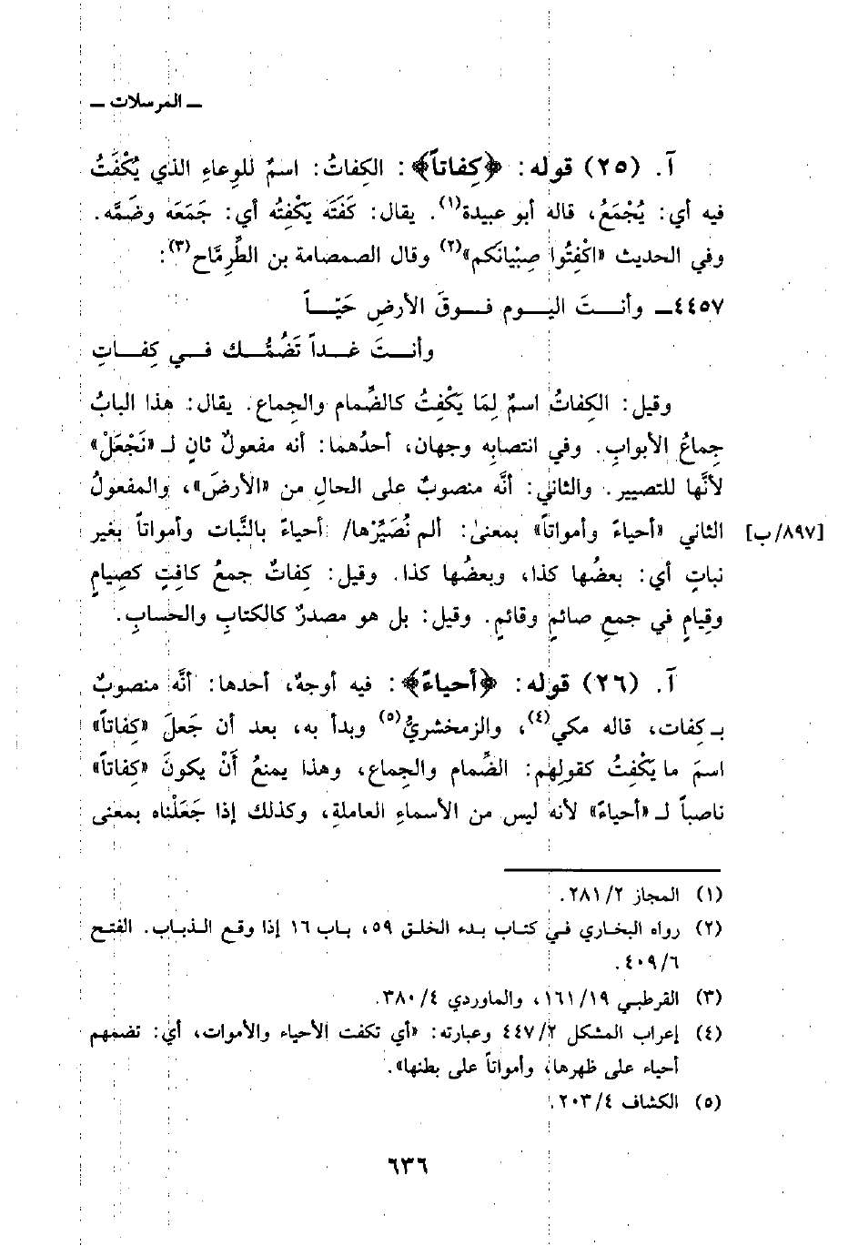 قوله: {كِفَاتاً} : الكِفاتُ: اسمٌ للوِعاءِ الذي يُكْفَتُ فيه أي: يُجْمَعُ، قاله أبو عبيدة. يقال: كَفَتَه يَكْفِتُه أي: جَمَعَه وضَمَّه. وفي الحديث «اكْفِتُوا صِبْيانَكم» وقال الصمصامة بن الطِّرِمَّاح: