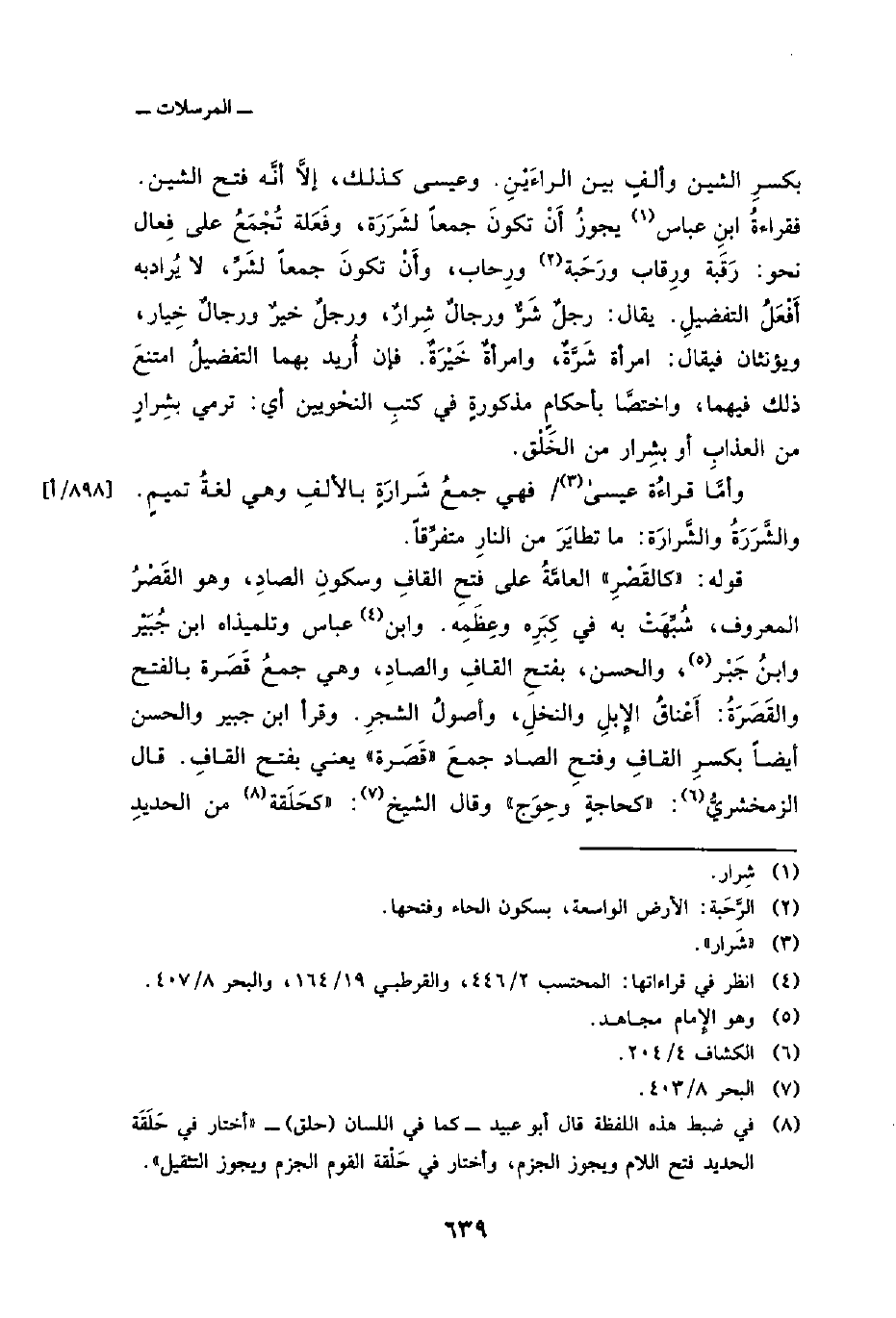 قوله: {كالقصر} العامَّةُ على فتح القافِ وسكونِ الصادِ، وهو القَصْرُ المعروف، شُبِّهَتْ به في كِبَرِه وعِظَمِه. وابن عباس وتلميذاه ابن جُبَيْر وابنُ جَبْر، والحسن، بفتحِ القافِ والصادِ، وهي جمعُ قَصَرة بالفتح والقَصَرَةُ: أَعْناقُ الإِبلِ والنخلِ، وأصولُ الشجرِ. وقرأ ابن جبير والحسن أيضاً بكسرِ القافِ وفتحِ الصاد جمع «قَصَرة» يعني بفتح القافِ. قال الزمخشريُّ: «كحاجةٍ وحِوَج» وقال الشيخ: «كحَلَقة من الحديدِ