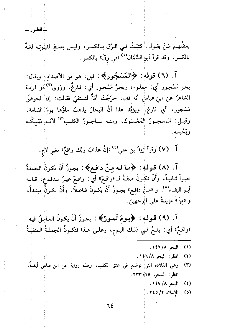 قوله: {المسجور} : قيل: هو من الأضدادِ. ويقال: بحر مَسْجور أي: مملوء، وبحرٌ مَسْجور أي: فارغٌ. ورَوى ذو الرمة الشاعرُ عن ابنِ عباس أنه قال: خرَجَتْ أمَةٌ لتستقيَ فقالت: إن الحوضَ مَسْجور، أي فارغ. ويؤيِّد هذا أنَّ البحارَ يذهبُ ماؤُها يومَ القيامة. وقيل: المسجورُ المَمْسوك، ومنه ساجورُ الكلب لأنه يَمْسِكُه ويَحْبسه.