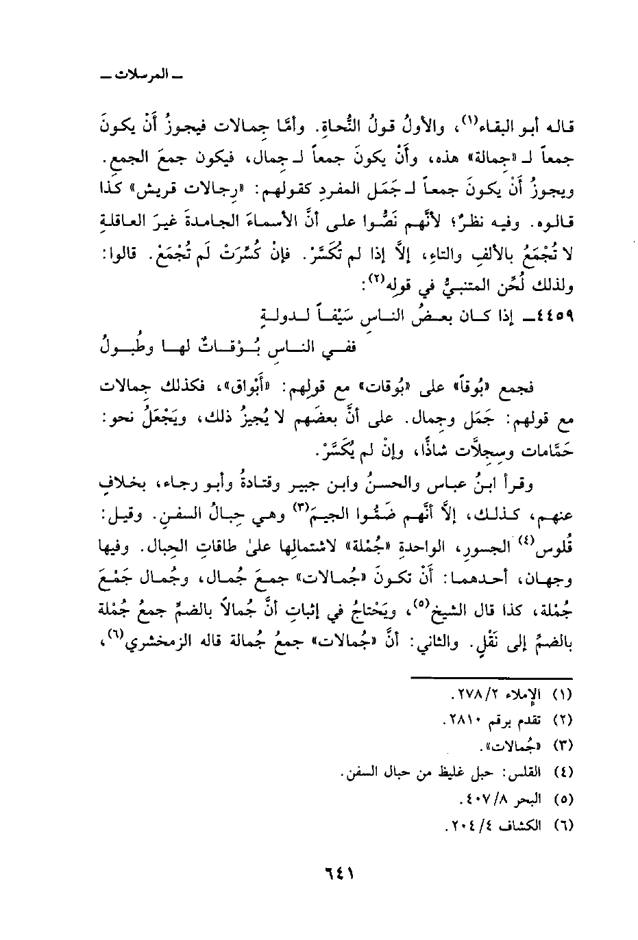 قاله أبو البقاء، والأولُ قولُ النُّحاةِ. وأمَّا جِمالات فيجوزُ أَنْ يكونَ جمعاً ل «جِمالة» هذه، وأَنْ يكونَ جمعاً ل جِمال، فيكون جمعَ الجمعِ. ويجوزُ أَنْ يكونَ جمعاً ل جَمَل المفردِ كقولهم: «رجِالات قريش» كذا قالوه. وفيه نظرٌ؛ لأنَّهم نَصُّوا على أنَّ الأسماءَ الجامدةَ غيرَ العاقلةِ لا تُجْمَعُ بالألفِ والتاءِ، إلاَّ إذا لم تُكَسَّرْ. فإنْ كُسِّرَْتْ لَم تُجْمَعْ. قالوا: ولذلك لُحِّن المتنبيُّ في قولِه:
