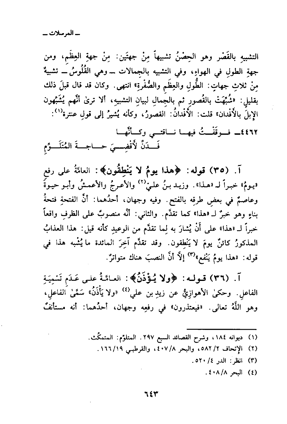 قوله: {هذا يَوْمُ لاَ يَنطِقُونَ} : العامَّةُ على رفعٍ «يومُ» خبراً ل «هذا» . وزيد بنُ عليّ والأعرجُ والأعمشُ وأبو حيوةً وعاصمٌ في بعضِ طرقِه بالفتح. وفيه وجهان، أحدُهما: أنَّ الفتحةِ فتحةُ بناءٍ وهو خبرٌ ل «هذا» كما تقدَّم. والثاني: أنَّه منصوبٌ على الظرفِ واقعاً خبراً ل «هذا» على أَنْ يُشارَ به لِما تقدَّم من الوعيدِ كأنه قيل: هذا العذابُ المذكورُ كائنٌ يومَ لا يَنْطِقون. وقد تقدَّم آخِرَ المائدة ما يُشْبه هذا في قوله: {هذا يَوْمُ يَنفَعُ} إلاَّ أنَّ النصبَ هناك متواترٌ.