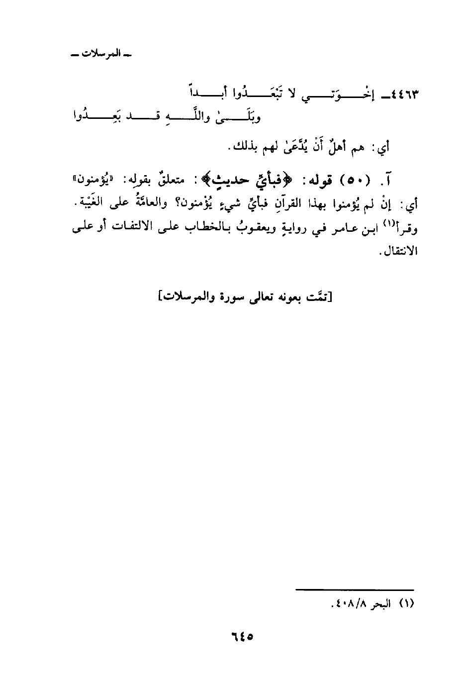 قوله: {فَبِأَيِّ حَدِيثٍ} : متعلقٌ بقولِه: «يُؤمنون» أي: إنْ لم يُؤمنوا بهذا القرآنِ فبأيِّ شيءٍ يُؤْمنون؟ والعامَّةُ على الغَيْبة. وقرأ ابن عامر في روايةٍ ويعقوبُ بالخطاب على الالتفات أو على الانتقال.
