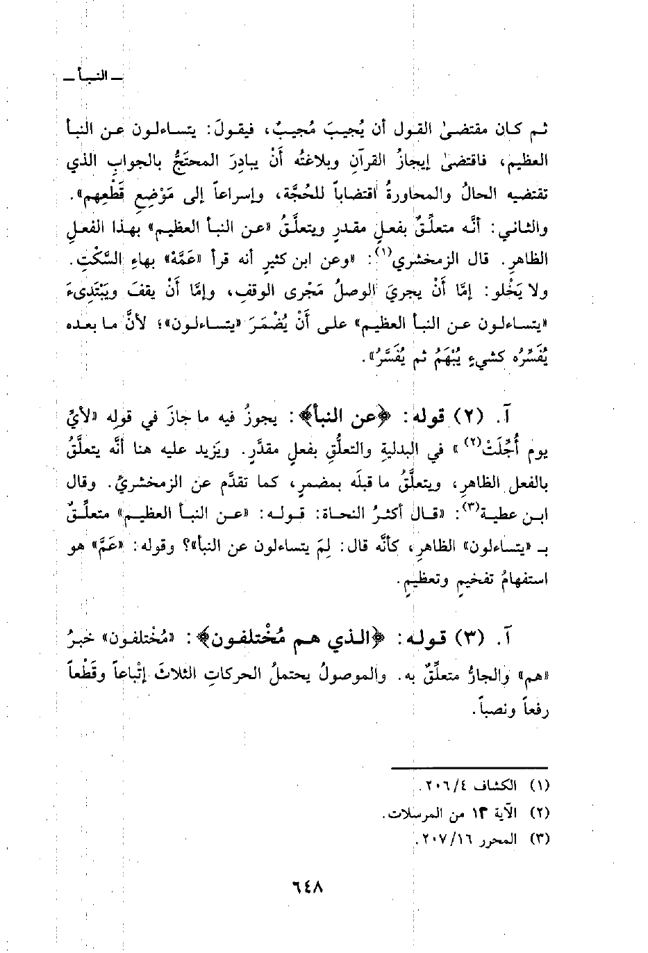 ثم كان مقتضى القول أن يُجيبَ مُجيبٌ، فيقولَ: يتساءلون عن النبأ العظيم، فاقتضى إيجازُ القرآنِ وبلاغتُه أَنْ يبادِرَ المحتَجُّ بالجوابِ التذي تقتضيه الحالُ والمحاورةُ اقتضاباً للحُجَّة، وإسراعاً إلى مَوْضِعِ قَطْعِهم» . والثاني: أنَّه متعلِّقٌ بفعلٍ مقدرٍ ويتعلَّقُ {عَنِ النبإ العظيم} بهذا الفعلِ الظاهرِ. قال الزمخشري: «وعن ابن كثيرٍ أنه قرأ» عَمَّهْ «بهاءِ السَّكْتِ. ولا يَخْلو: إمَّا أَنْ يجريَ الوصلُ مَجْرى الوقفِ، وإمَّا أَنْ يقفَ ويَبْتَدِىءَ {يَتَسَآءَلُونَ عَنِ النبإ العظيم} على أَنْ يُضْمَرَ» يتساءلون «؛ لأنَّ ما بعده يُفَسِّرُه كشيءٍ يُبْهَمُ ثم يُفَسَّرُ» .