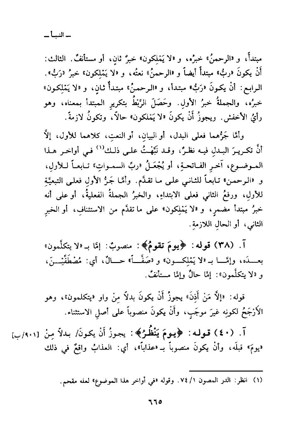 مبتدأً، و «الرحمنُ» خبرُه، و «لا يَمْلِكون» خبرٌ ثانٍ، أو مستأنفٌ. الثالث: أَنْ يكونَ «ربُّ» مبتدأً أيضاً و «الرحمنُ» نعتُه، و «لا يَمْلِكون» خبرُ «رَبُّ» . الرابع: أنْ يكونَ «رَبُّ» مبتدأ، و «الرحمنُ» مبتدأٌ ثانٍ، و «لا يَمْلِكون» خبرُه، والجملةُ خبرُ الأولِ. وحَصَلَ الرَّبْطُ بتكريرِ المبتدأ بمعناه، وهو رأيُ الأخفش. ويجوزُ أَنْ يكونَ «لا يَمْلكون» حالاً، وتكونُ لازمةً.